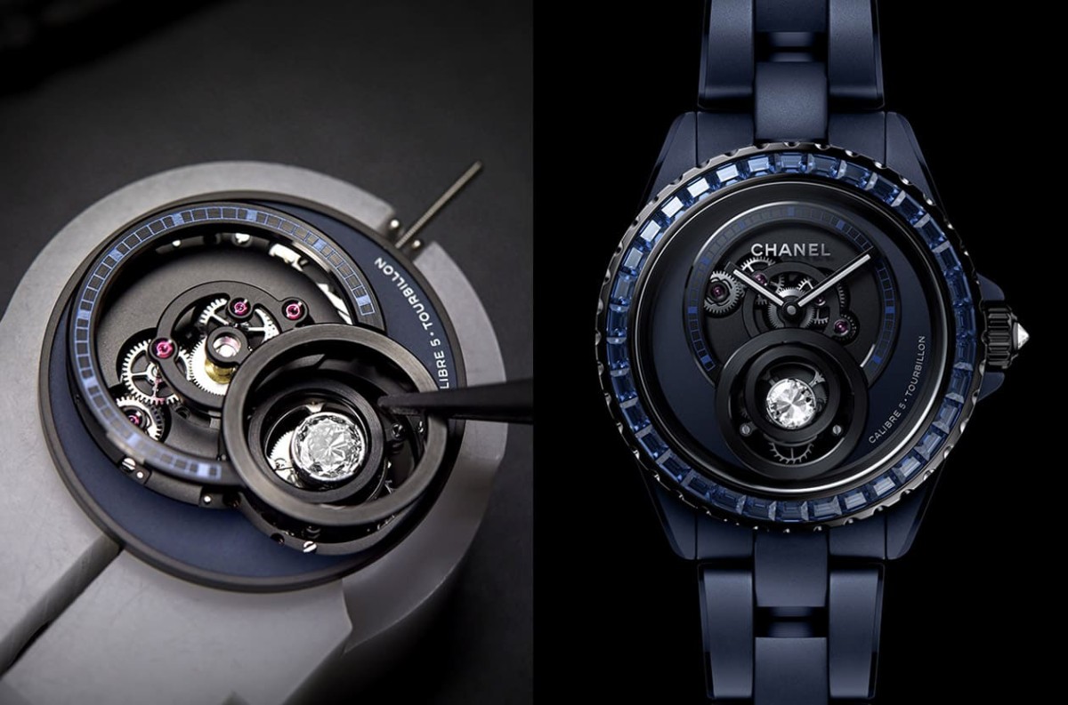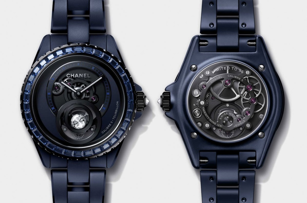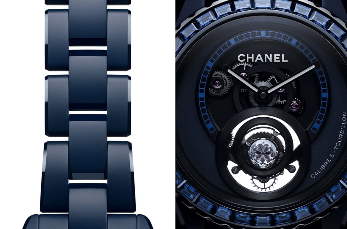 開面設計的藍色面盤與霧面藍色陶瓷互相呼應,至於面盤中央透視出的部分機芯零件,包含主要輪系橋板、陀飛輪框架等都鍍上黑色,包括時、分小錶盤的刻度環也是黑色,與藍色刻度、黑色夜光指針等都是出自貫徹藍黑組合的設計。6點方向的陀飛輪源自香奈兒開發的第五枚自製機芯Caliber 5,其與市面上多數陀飛輪相較有個明顯特點在於框架軸心鑲上一顆約重0.18克拉的獨特切割鑽石,由於陀飛輪每分鐘旋轉一圈,帶有無數切面的鑽石軸承因此能夠自行散發出閃耀璀璨的光芒。腕錶背面的透明底蓋周圍同以霧面藍色高抗磨陶瓷,底蓋上緣刻有"LIMITED TO 55"字樣烘托其稀有性,整枚機芯遵循CHANEL自製機芯共通的圓形邏輯,零件與正面相同多數鍍上黑色,另在接近9點方向鑲有一枚獅子圖騰,是品牌象徵高級製錶工藝的印記。