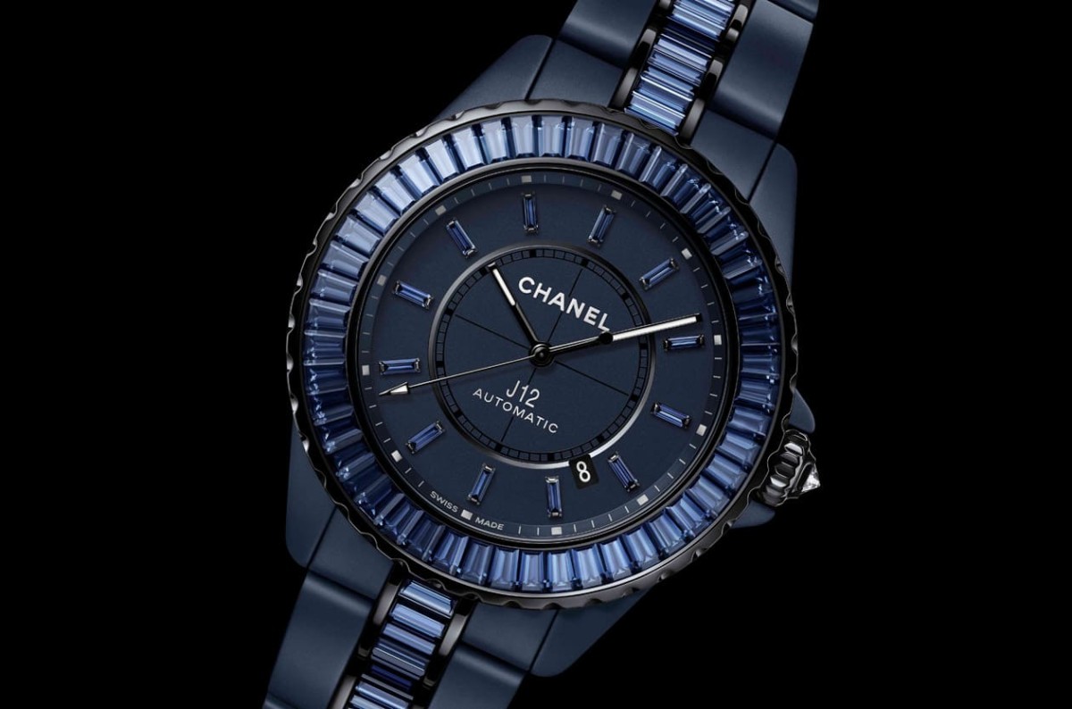 香奈兒腕錶創意總監Arnaud Chastaingt奠基於「Toi et moi(你和我)」的設計概念,分別打造出28mm與42mm的J12 Bleu藍寶石腕錶,兩款作品既能以套錶形式出售,也能單獨銷售以因應市場的多元需求。J12 Blue 42mm藍寶石腕錶採用霧面藍色高抗磨陶瓷和黑色塗層精鋼(錶圈、錶冠以及中央鍊節)製成,包括錶圈以及中央鍊節都鑲上大量天然藍色藍寶石,面盤也鑲有12顆長階梯形切割藍色藍寶石時標更添低調奢華感。42mm款式搭載CHANEL自製Caliber 12.1自動機芯,這枚機芯動力長達70小時,走時精準度通過COSC瑞士天文台認證,達到每日誤差-4~+6秒的優異水準。