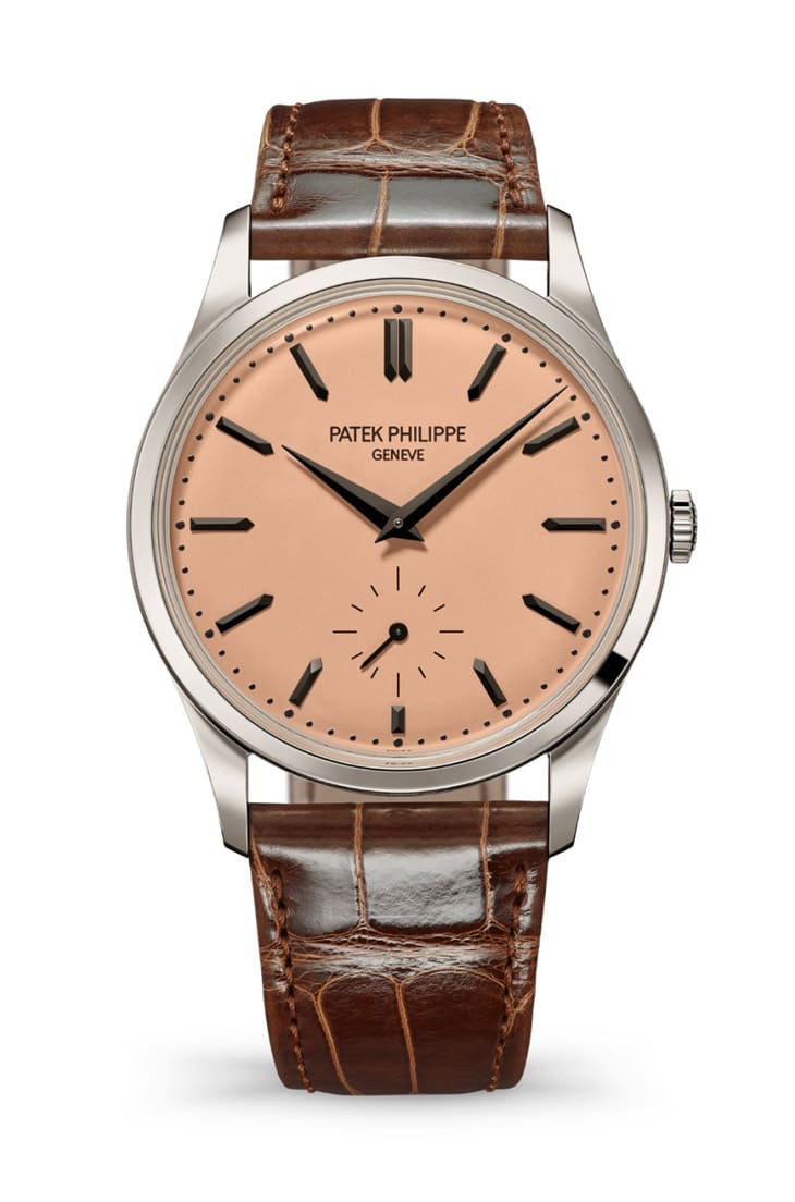 Calatrava系列再添一款手上鍊小三針基本款,其採用鉑金材質,搭配予人溫暖感受鮭魚色面盤,展現一點復古懷舊風情。錶殼以抛光設計偏向低調,搭配光斜角錶圈、緞紋磨砂側緣與修長錶耳,展現俐落流暢的美學造型,搭配上棕色鱷魚皮錶帶盡顯雅緻個性。手錶搭載30-255 PS手上鍊機芯,機芯提供65小時動力儲存,並具備停秒裝置,使錶主可以調校至更為精準的程度。