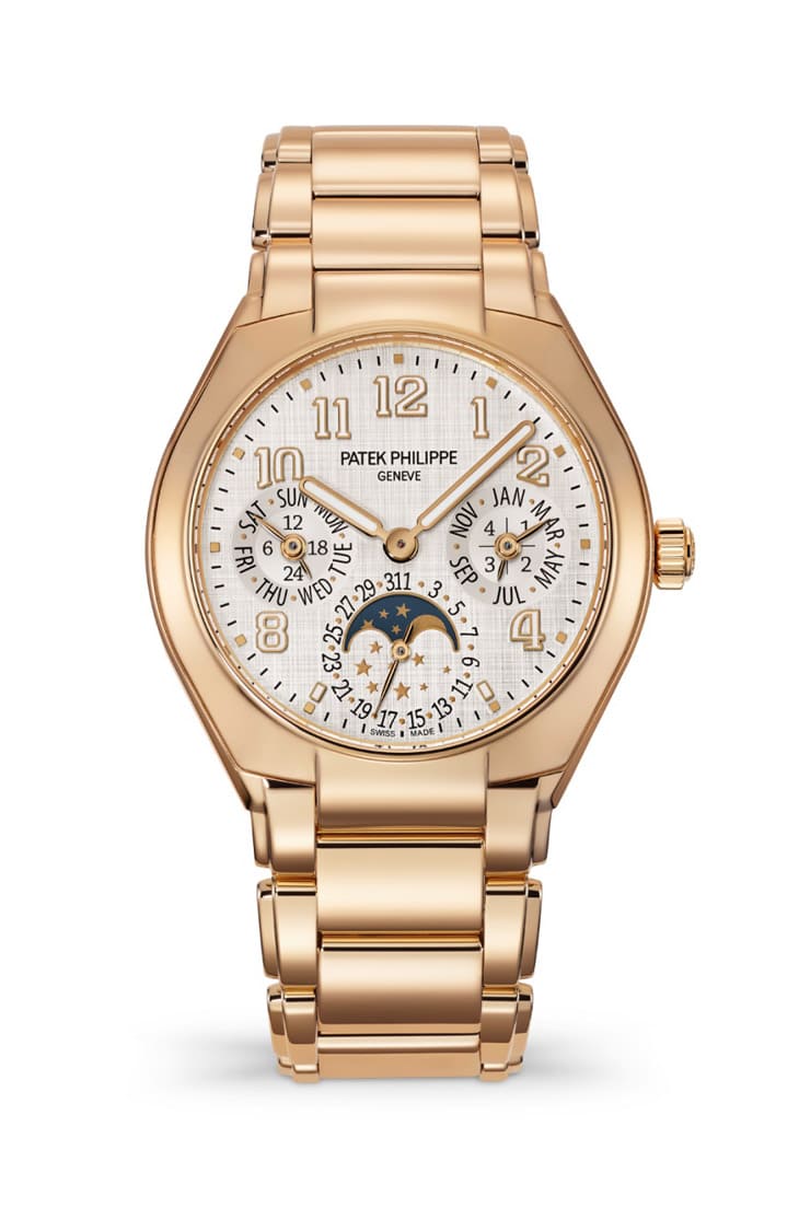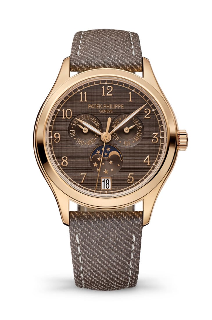 玫瑰金年曆錶4946R-001的錶殼直徑為38mm,設計符合男女性的腕圍,屬於中性的複雜功能作品。溫暖的玫瑰金與棕色面盤搭配相得益彰,面盤經過水平與垂直缎紋磨砂處理,縱橫交錯呈現絲綢般的光澤感。手錶配置的棕色小牛皮錶帶飾有牛仔布紋圖案,兩側點綴乳白色撞色縫線,搭配玫瑰金針扣。此款作品搭載的26‑330 S QA LU機芯承襲百達翡麗於1996年發明取得專利的年曆裝置,特色就是每年只需在二月底手動調校日期一次,便利性高出一般的全日曆手錶一截。