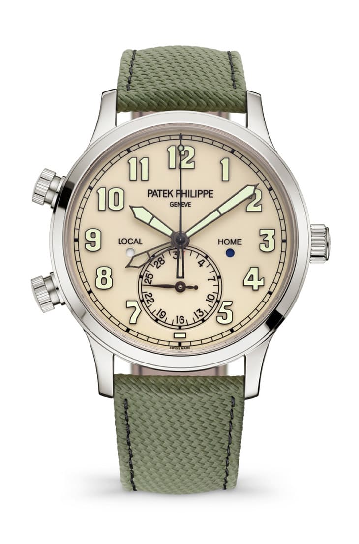 藍面的5524G-001前腳剛停產,象牙白色漆面的5524G-010就接力登場,這款百達翡麗少見的飛行錶再度採用白金材質錶殼,除了面盤更新顏色,連錶帶也變更為卡其綠色複合材質,這種錶帶表面具備編織般的紋理圖案,觸感和視覺感受都有新意。手錶搭載26-330 S C FUS自動機芯,能呈現符合現代實用需求的兩地時間功能,6點方向設有指針式日期顯示,日期與當地時間同步,而兩地時間指針也可用錶殼左側的按把快調,加上兩地日夜顯示,讓人隨時都能清楚掌握兩時兩地的正確時刻,這套雙時區按把融入專利保險系統,可以避免佩戴者操作時意外調錯所在地時間,周到的設計既實用又好用。
