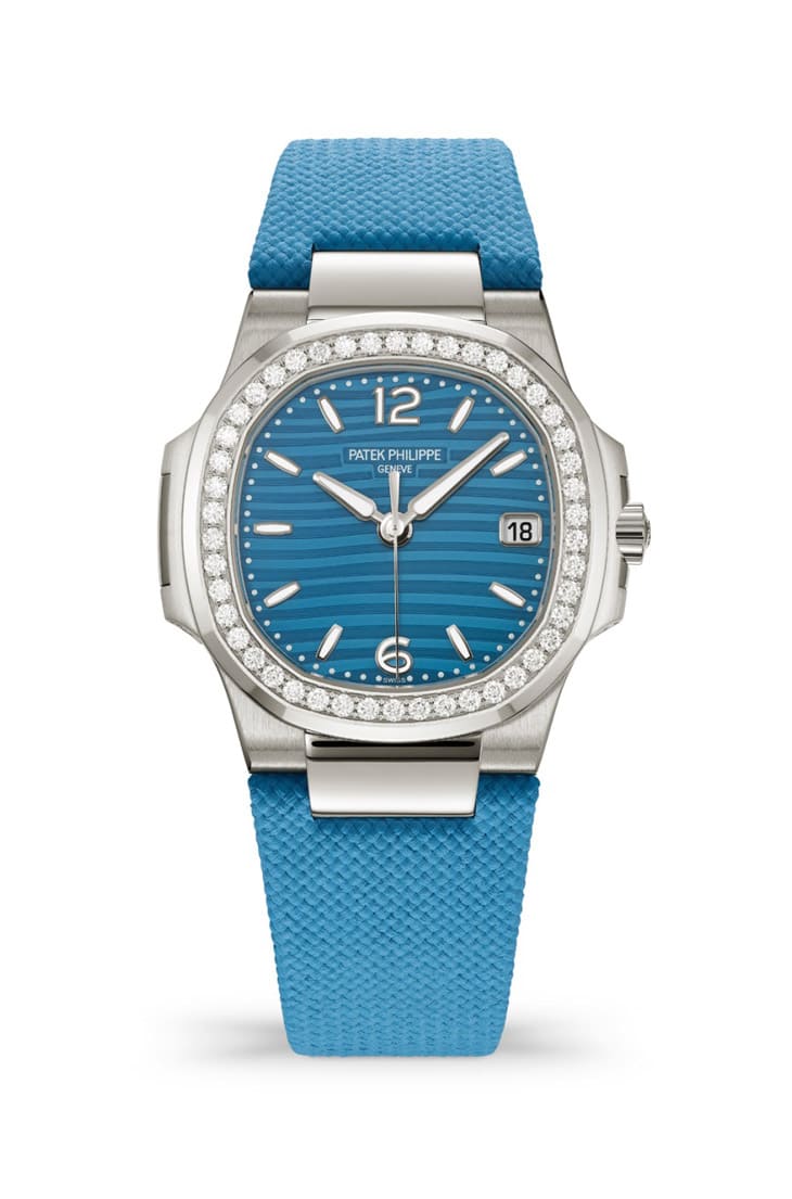 金鷹系列還推出兩款小巧的石英女錶,展現百達翡麗對色彩搭配的新詮釋。其中7010G-013採用32mm白金錶殼,搭配天藍色漆面面盤,表面飾有Nautilus系列女錶標誌性的波紋圖案,手錶的八角形表錶圈鑲嵌46顆明亮式切割鑽石,並搭配藍色耐磨複合材質錶帶及白金折疊扣,富有中性活力。