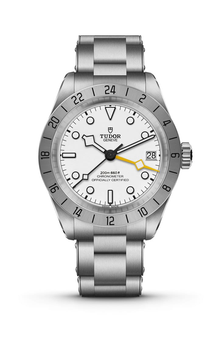帝舵於2022年首度推出的Black Bay Pro,將人氣Black Bay系列改造為符合探險用途的工具錶。此款作品配備經磨砂處理的24小時刻度外圈,並搭載具有GMT功能的帝舵MT5652機芯,特別適合探索極地或地底環境。新款有別於前做的黑色面盤,嶄新換上蛋白色面盤,搭配黑色陶瓷鐘點標記與指針,由高對比性提升了手錶視讀性,達到一目了然的辨時效果。Black Bay Pro採用的橘黃色雪花指針清晰展示兩地時間,並具備能夠獨立調校的作用,搭配3點方向實用強的日期顯示,讓佩戴者能夠獲得日常所需的必要資訊。前面提到手錶搭載MT5652機芯,它不僅具有70小時的動力儲存,有經過瑞士天文台認證(COSC),展現機芯的精準度與品質。白面的Black Bay Pro一如黑面,分別有鍊帶、織紋錶帶及皮膠合成錶帶等三種選擇,滿足市場不同佩戴需求,如今加上新色面盤後,鎖定這款式要考慮的又會再多一點。