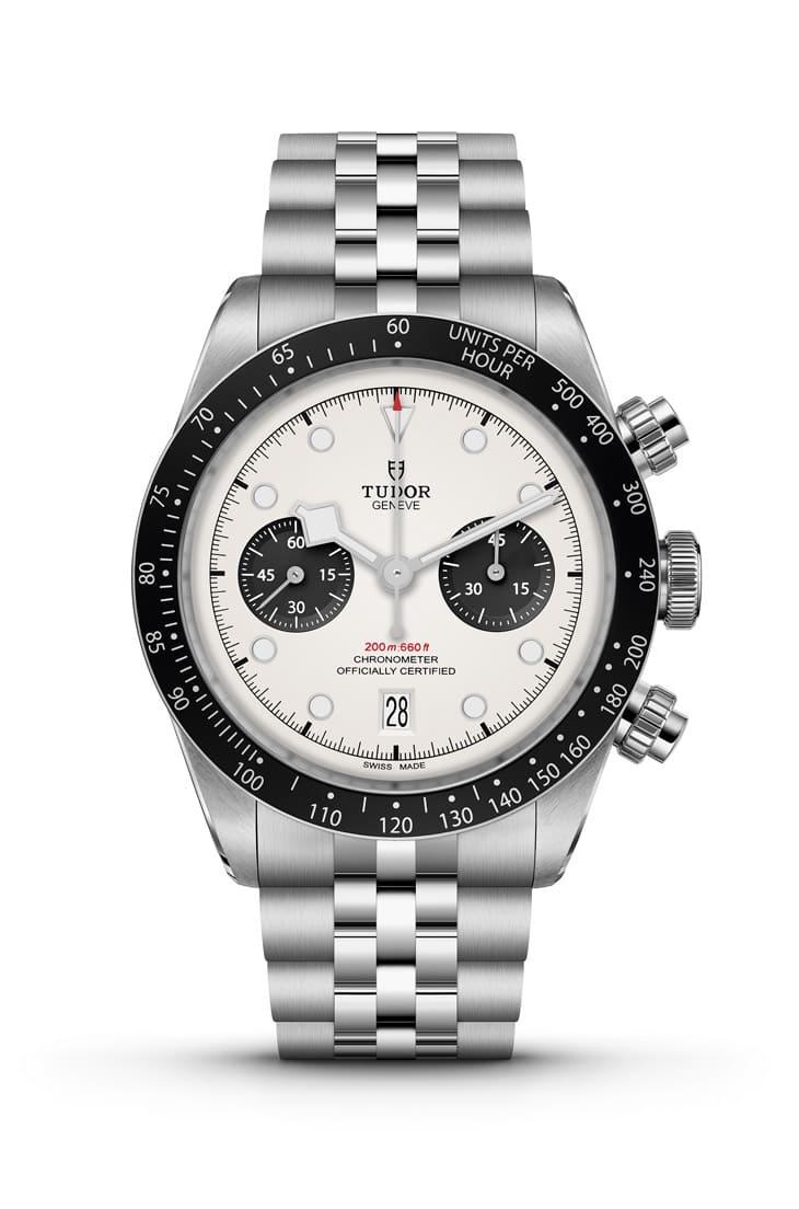 Black Bay Chrono計時碼錶跟上帝舵近年導入五珠帶的腳步,於原本的黑色或蛋白色面盤中停產織紋錶帶和復古皮帶設計,繼而帶入五珠帶。除了錶帶的變化,手錶內外並沒有明顯的修改,例如41mm的不鏽鋼錶殼、旋入式計時按把,以及黑色的測速計刻度鋁圈,還有系列招牌的雪花指針等。手錶配備的五道鍊節「鉚釘式」不鏽鋼鍊帶,靈感來自1950~1960年代的經典設計,鍊帶同樣搭載帝舵的T-fit快速調節錶扣,佩戴者可輕鬆調整鍊帶長度,讓手錶的佩戴舒適度更上層樓。