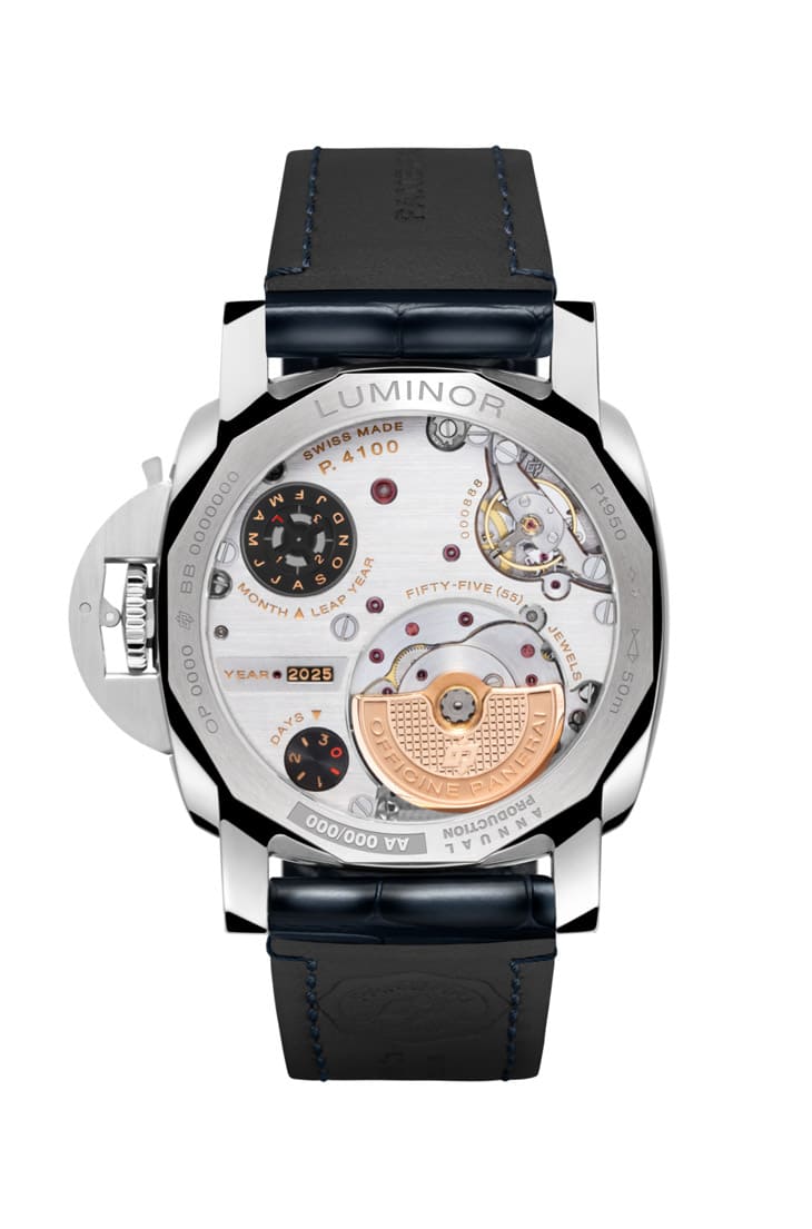 錶款以沛納海專利鉑金Platinumtech™材質打造,這是一種由95%純鉑金製成的特殊合金。44mm錶殼搭配標誌性的錶冠護橋裝置和耀眼的藍寶石水晶面盤,搭配透明視窗使佩戴者得以清楚看見日期和星期轉盤移動的過程。面盤擁有鮮明的湛藍色調與塗覆夜光塗層的時標和指針形成對比,手錶採用Super-LumiNova® X2夜光塗層,使其在黑暗中也能發出鮮豔的綠色光芒。PAM01575搭載P.4100機芯,其具備三日動力儲存,各項日曆資訊不僅顯示於面盤上,包括錶背也還有月份、閏年、年份以及動力儲存顯示,如此使面盤得以保持PANERAI一貫的清爽風格。透過錶背藍寶石水晶底蓋,可以一窺機芯背部時間資訊之餘,也可以欣賞微型自動盤和機芯零件的打磨修飾。