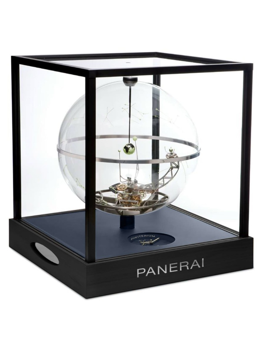 沛納海這款木星儀特色在於能夠準確還原太陽、月球、木星以及其衛星的位置。星體軌道由手動上鍊結構引導驅動,並搭載萬年曆的功能,其以單行顯示窗呈現,實際模擬天體運行。機械結構內設置8個發條盒,這也是木星儀40天動力儲存的關鍵原因,整個裝置密封於一個75x86cm的玻璃箱中,並置於桃花心木底座上。鐘盤位於中央天文球體下方,黑色鐘盤搭配棒狀時標,12點方向和6點方向則設有兩個大尺寸的夜光阿拉伯數字,即使是在光線不足的環境下也能輕鬆讀時,同時時針、分針和秒針亦塗覆Super-LumiNova®夜光塗層。此外,鐘盤設有日夜標示並刻有「40 giorni」(40天)字樣的線性動力儲存顯示。盤面上鐫刻著「Jupiterium(木星儀)」字樣,並以線性方式排列顯示星期、日期、月份和年份等萬年曆資訊。