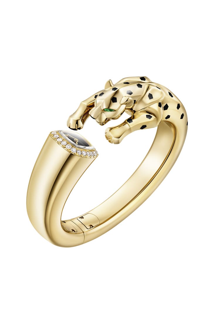 卡地亞美洲豹珠寶手錶既是珠寶,亦是手錶,融匯CARTIER兩大領域之長,外型方面既有立體美洲豹雕刻蓄勢待發;另一方面"toi & moi"造型手環又令美洲豹與時計構造渾然結合。錶款以黃金打造,呈現美洲豹精煉身軀線條、優美的肌肉輪廓,上半部更點綴黑色真漆豹紋的毛皮裝飾,營造生動的動物形象。美洲豹的沙弗萊石豹眼和縞瑪瑙豹鼻,與黑色真漆面盤、鋪鑲鑽石的錶圈以及12點方向的鑽石時標形成矚目對比,展現出卡地亞設計的巧妙以及紮實的工藝技術。