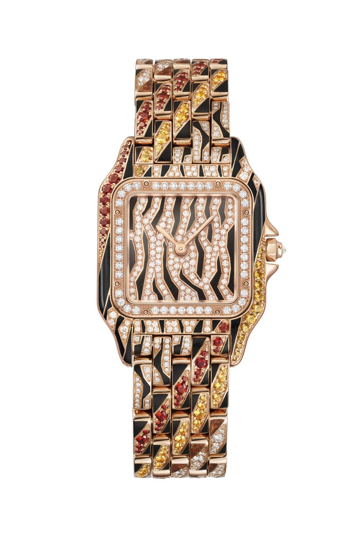 美洲豹系列不斷推陳出新,卡地亞今年仍舊從豐富多變的美洲豹形象中汲取靈感,透過抽象毛皮斑紋,將斑馬與老虎的特徵融匯一體,手錶多方採用黑色和金棕色漆藝、鋪鑲鑽石與橘色、黃色錳鋁榴石形映成趣,塑造大膽視覺印象。Panthère De Cartier系列主打作品美洲豹全鋪鑲鑽石手錶擁有手工塗覆、再以高溫燒製的漆藝,面盤上鑲嵌顆雪花鑲嵌明亮式切割鑽石加以點綴,搶眼的造型突顯了系列源自大自然生物的躍動活力。