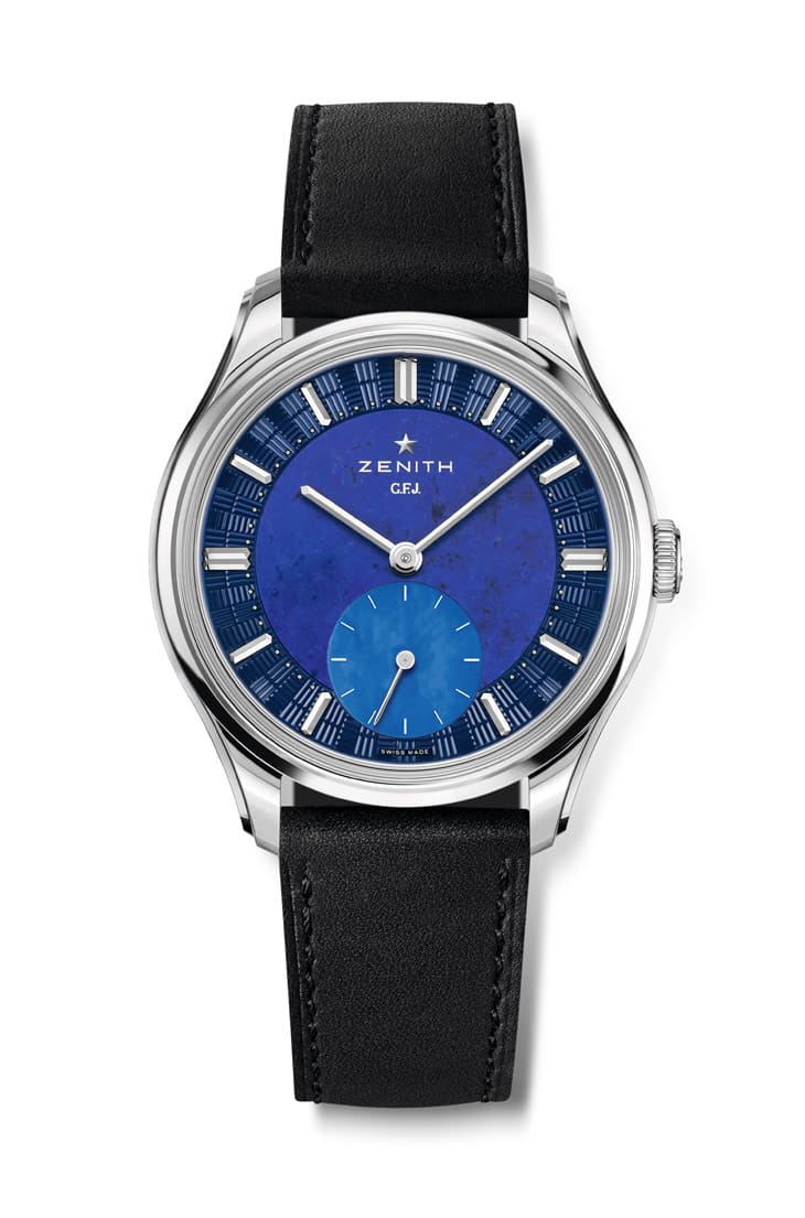G.F.J.紀念錶以纖薄39mm鉑金錶殼呈現,階梯式錶圈與錶耳設計呼應1950年代風格,拋光與緞面交錯修飾。凹槽式錶冠刻有創辦人Georges Favre-Jacot的姓名縮寫「G.F.J.」,呼應錶名與品牌基因。面盤外圍飾以ZENITH錶廠磚牆意象雕花,搭配白金立體時標與40顆珠粒分鐘刻度,面盤中央以天然青金石打造,金黃鐵礦點綴如夜空繁星,使每一只錶皆顯得獨一無二;6點鐘位置為珍珠母貝小秒盤,與白金指針搭配相得益彰。