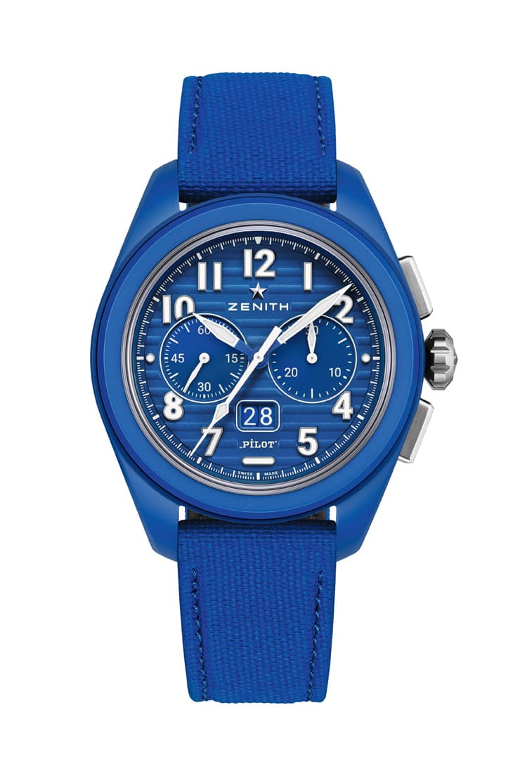 Pilot大日期飛返計時碼錶以引人注目的藍色新亮相,錶殼、面盤和錶帶均為同色調。42.5mm錶殼以微噴砂陶瓷製成,搭配鈦金屬錶冠和長方形按把。波紋面盤上的指針和大型阿拉伯數字均塗覆夜光物料。手錶搭載El Primero 3652自動機芯,整合了大日期顯示和飛返計時功能,前者採用兩位數字顯示,專利機制可在0.007秒內實現瞬跳,而飛返計時功能讓佩戴者只需按動一次按把即可將計時碼錶歸零並重啟,便利性和視讀性都較一般計時碼錶更上層樓。