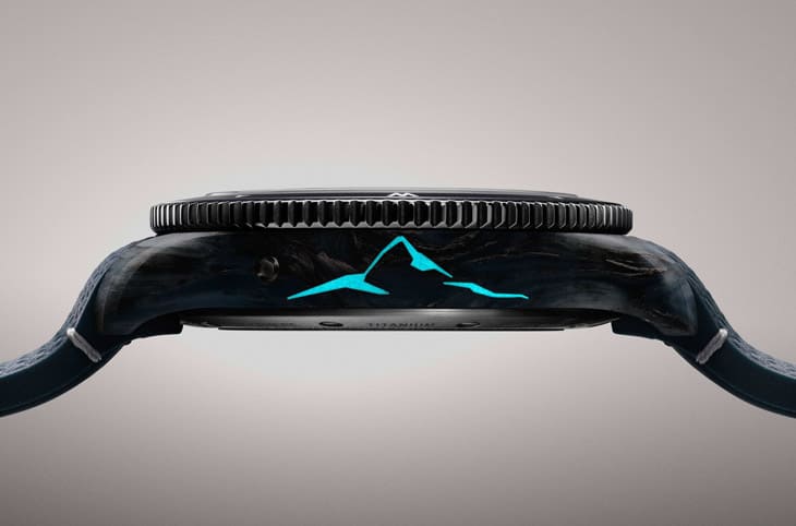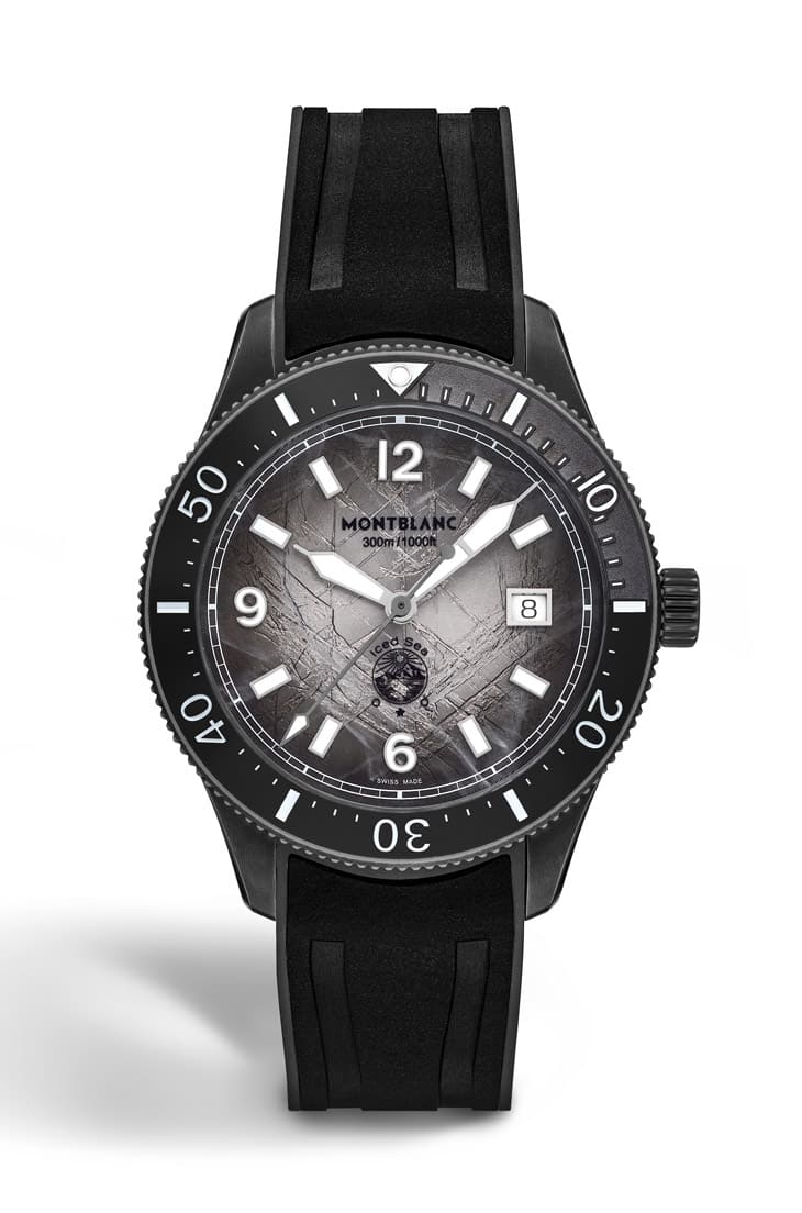 此款採用堅固的仿舊不鏽鋼錶殼,其獨特的陳舊和風化外觀是在不鏽鋼表面加上黑色鍍層後,再經由手工清洗並使用來自白朗峰山脈的石英岩進行刷紋處理而成,使得每一只錶都能呈現獨一無二的風貌。面盤則採用灰色暈染冰川圖案,重現冰體的色彩和紋理——其底層是透過Gratté-boisé工藝製作,能呈現豐富的層次感和光澤,暈染效果則採用義大利古老工藝,使不同色彩與色調柔和融合。手錶以零氧技術製成,並通過ISO 6425潛水錶認證,錶背底蓋飾有3D鐫刻,呈現潛水員和冰山圖案。