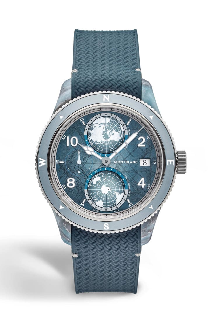 鈦金屬、藍綠色複合材質/MB 29.25自動上鍊機芯/時、分、日期顯示/南北半球旋轉地球儀世界時區顯示/兩地時間顯示/藍寶石水晶鏡面/防水100米/錶徑43.5mm/限量986只/參考價:NT$ 303,400