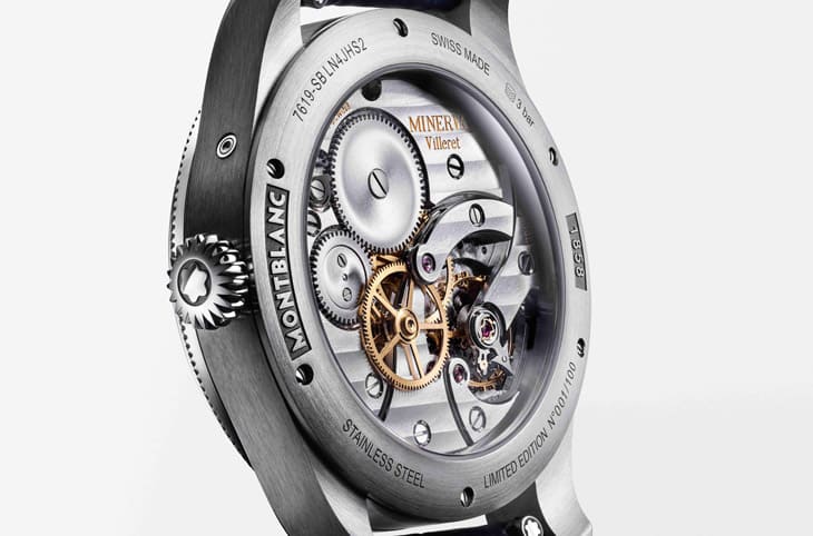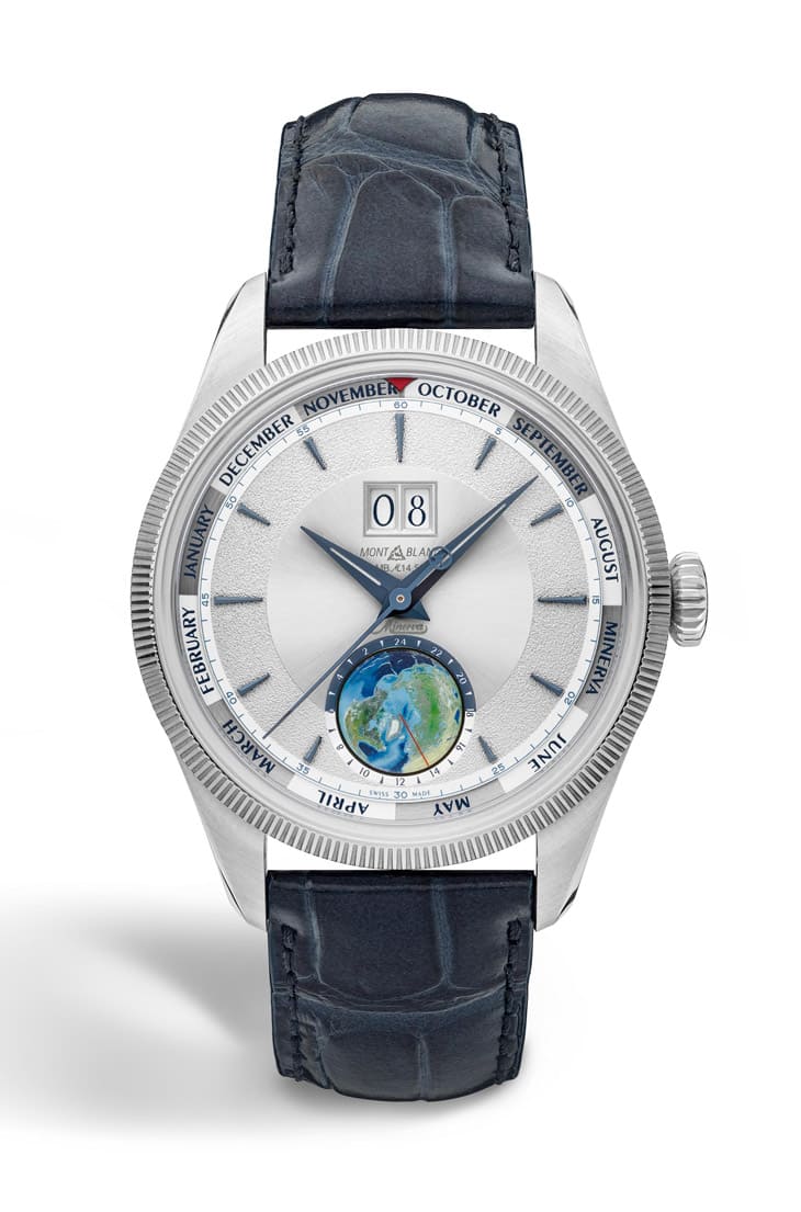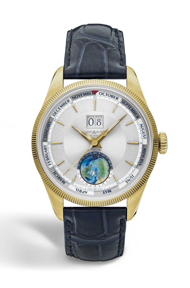 此為首款搭載Minerva年曆機芯的Geosphere手錶,對於萬寶龍而言又是一大工藝技術面的進展。手錶內部的自製手上鍊Minerva機芯(MB M14.58)具備年曆功能,可顯示時、分、秒、大日期和月份,並且兼融世界時區功能,機芯由336枚組件構成,提供約65小時動力儲存,其以傳統高級製錶工藝手工裝飾,例如日內瓦波紋和蝸紋打磨飾面。其中一款為不鏽鋼錶殼(限量100只),搭配18K白金固定式錶圈,另一款則是18K萊姆金錶殼搭配同材質錶圈,它們的凹槽錶圈設計靈感皆來自Minerva1920年代的的經典作品,從中展現出一絲復古情懷。手錶還有一個視覺焦點在於手繪的立體旋轉北半球地球儀,提供24小時日夜顯示作用,地球儀圖案上還有一道橘色線,原來那是標示格林威治標準時間的子午線。面盤外圍的月份刻度部分,七月被"Minerva"字樣取代,此處的特別設計乃是要紀念Minerva商標及其箭頭於1887年「7月」30日註冊,小小的變化蘊含萬寶龍深刻的歷史淵源。