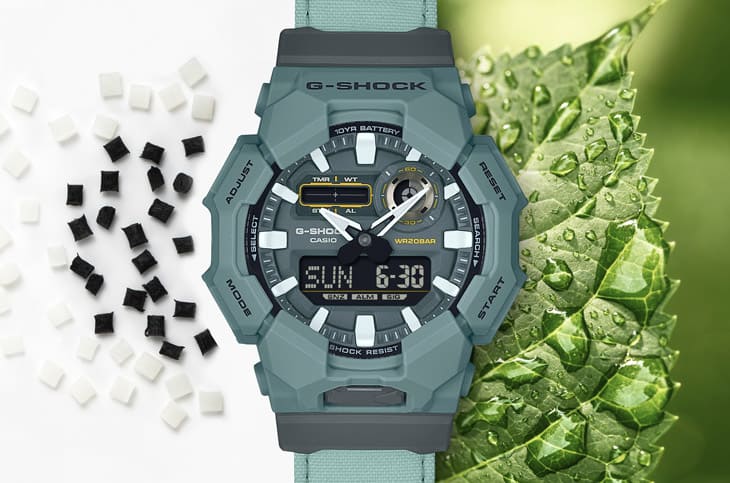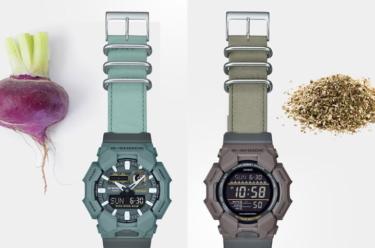 這次G-SHOCK還特別用上環保材質,像是錶殼、錶圈和錶耳都用生物基樹脂製成,幫助降低碳排放,此外錶帶則選用 CORDURA® re/cor™再生材質,耐用又富有永續概念;值得一提的是錶帶染色部分,G-SHOCK與日本的FOOD TEXTILE計畫合作,這個計畫的核心理念就是「把原本會被丟棄的食材,變成天然染料」,是一種結合永續理念與時尚美感的做法,簡單來說,這不只是一條「好看的錶帶」,它背後還藏著「減碳、減廢」的環保態度,讓人戴出門的時候,不只是有型有款,還把個人對環保的態度理念戴在手上。
