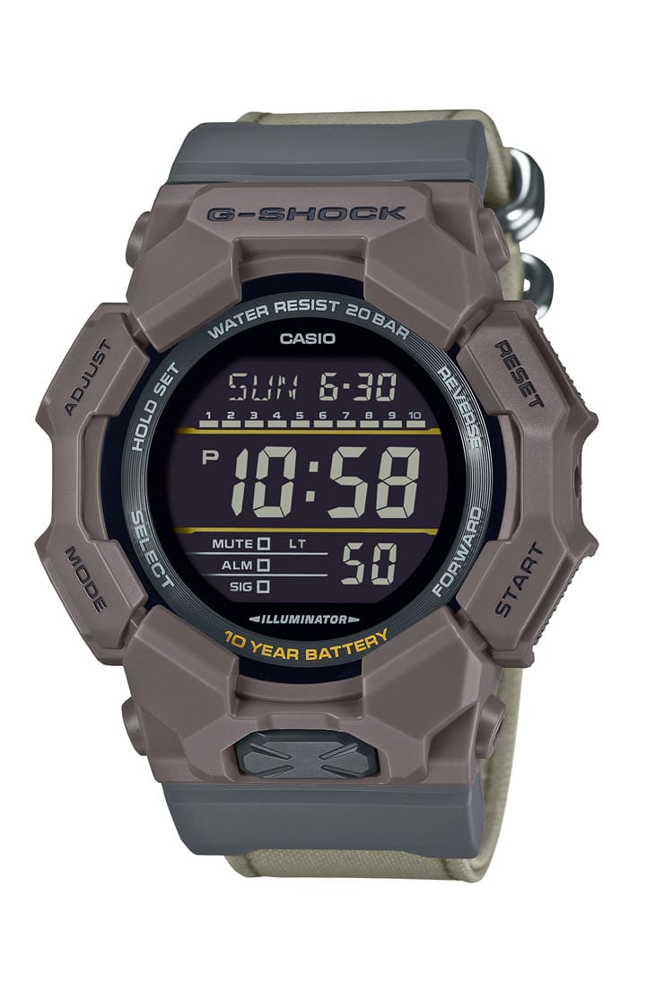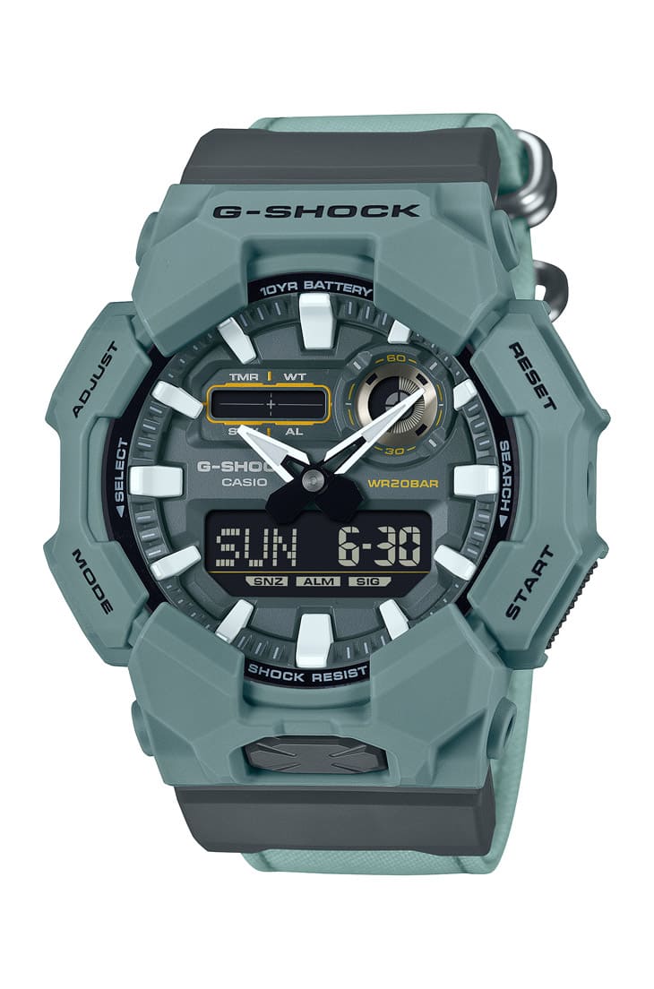 GA-010CE-2A以柔和的青藍色搭配布質錶帶,特別適合搭配工裝風格;而GD-010CE-5則選用低調的大地色系示人,視覺感受顯得更成熟穩重。兩款手錶都採用符合人體工學設計的正面按把,加上立體錶殼結構,操作時既直覺簡易,還能兼顧替造型加分效果。