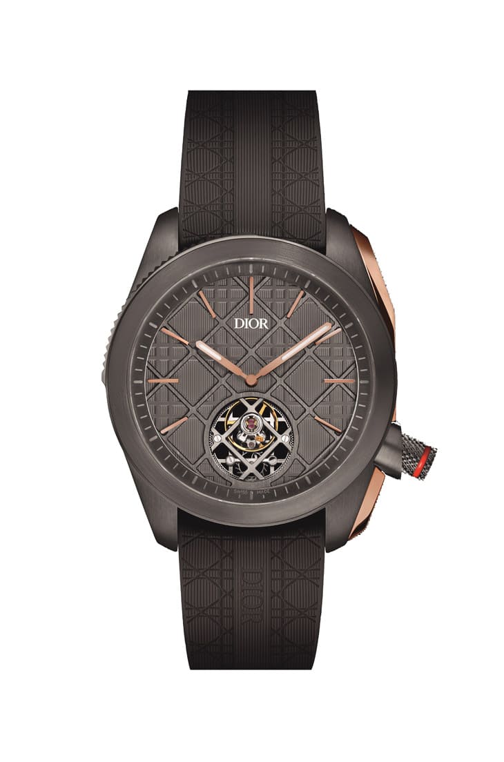 錶殼以霧面與拋光細節的結合巧添細緻感,營造出對比之美。兩款獨家 Chiffre Rouge Tourbillon Grey Ultramatte 陀飛輪腕錶以飛行陀飛輪彰顯精緻美感,並將籐格紋圖案重新演繹,每 15 秒便會出現在錶盤上一次。從錶殼到鱷魚皮錶帶,整體灰色調鋪陳,細膩致敬DIOR的傳承與創意。一款採鍍灰色PVD精鋼錶殼點綴玫瑰金元素,另一款採18K白金錶圈並於全錶共鑲嵌數百顆鑽石,呈現霜凍效果,突顯珍稀性。