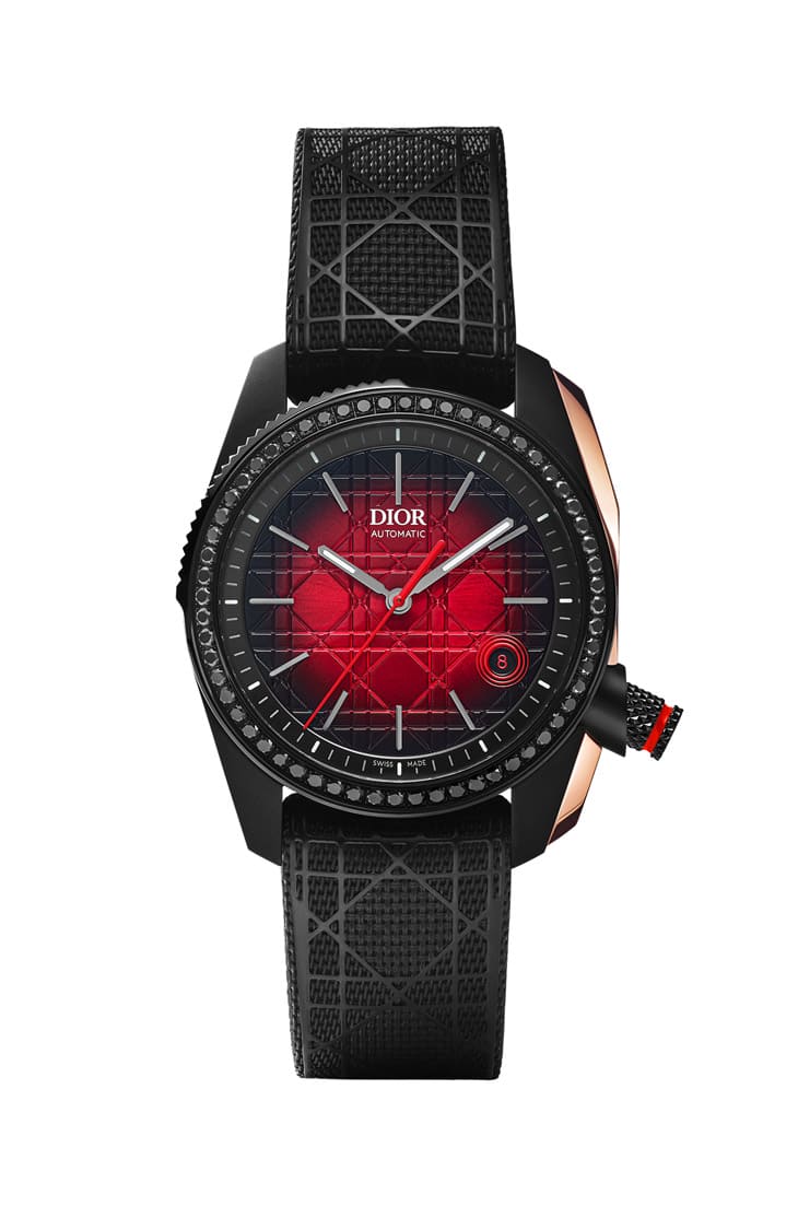 Chiffre Rouge 系列腕錶2025 年融入高級訂製美學,此季推出三款極具當代感的全新版本:38 mm錶徑款式提供簡約款式或鑲鑽版本,搭配玫瑰金元素;以及一款 41 mm錶徑計時碼錶,配備能精確至 1/10 秒的計時機芯。錶盤融入迷人漸變紅色調,搭配黑色勾邊輪廓與太陽放射紋,散發如波浪般的光澤,並融入DIOR經典的籐格紋元素,籐格紋亦呈現在自動盤及可替換的橡膠錶帶上,打造完整的Dior風格。