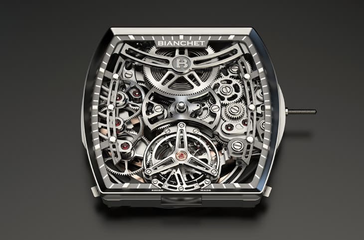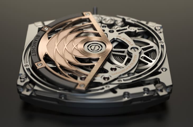UltraFino的最大亮點其實是來自於內部的UT01自動飛行陀飛輪機芯,這是BIANCHET自主研發的第一枚自動機芯,全由鈦金屬打造,重量只有8克!令人驚豔的是,自動盤採用黃金製成,設計靈感來自斐波那契螺旋(Fibonacci spiral),在實現高效上鍊的同時,也將BIANCHET對於數學比例之美的堅持,化為機械結構中的詩意存在。別忘了,這枚機芯儘管纖薄,動力儲存卻達60小時,達到實用與美感的平衡。