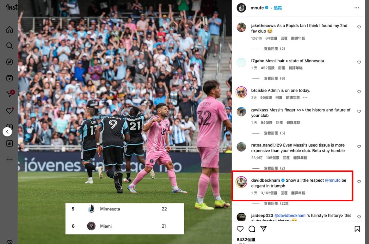 ▲明尼蘇達聯近日在贏得與邁阿密國際的比賽後,故意在社群媒體上嘲諷對手,引來邁阿密國際老闆貝克漢不悅,親自上社群回應。Source:Instagram @mnufc