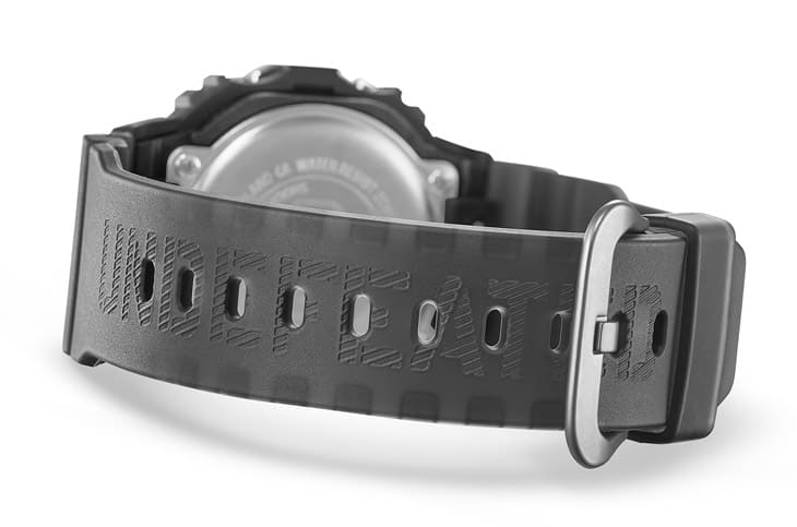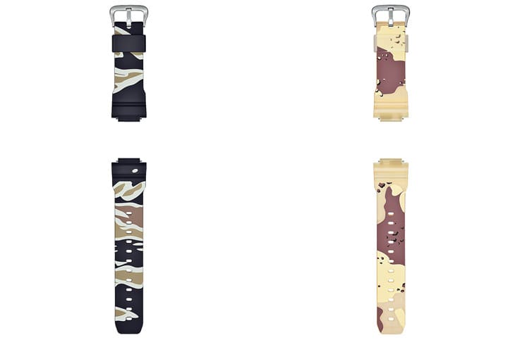 說到錶帶,這只DWE-5600UD還隨附兩款額外迷彩錶帶,讓錶主可以隨心變換風格,除了原本的黑色半透明樹脂款,還有一款虎紋迷彩和一款沙漠迷彩,前者是不透明的軍事感十足,後者則是半透明設計,風格更輕盈。三條錶帶任意切換,穿搭靈感彷彿也跟著源源不絕。
