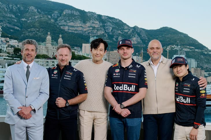 ▲左起為2025年F1摩納哥大獎賽上,影星Patrick Dempsey、紅牛車隊主席Christian Horner、韓星李政宰、車手Max Verstappen、泰格豪雅全球執行長Antoine Pin與車手角田裕毅。