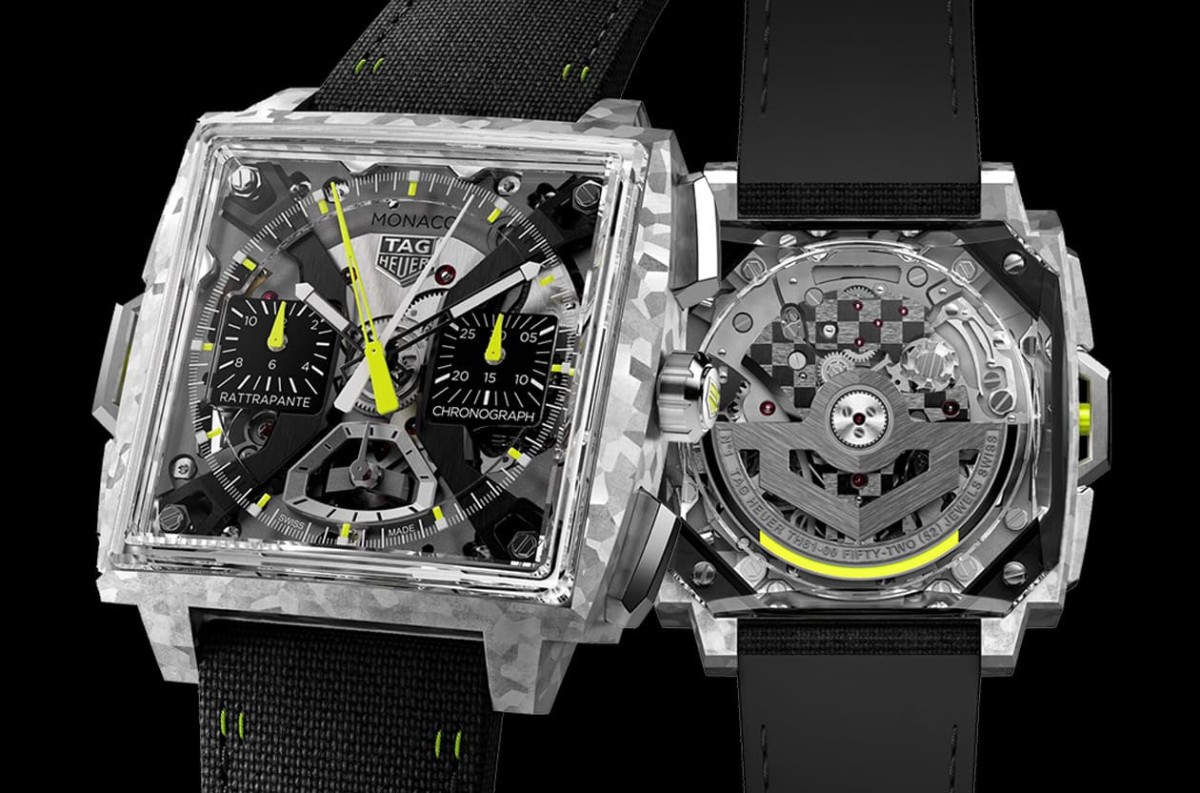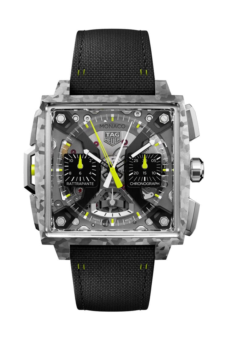 壓軸要說的是Monaco鈦金屬雙追針計時碼錶,這款完全就是把「前衛」兩個字寫在臉上,它用的是泰格豪雅自家實驗室開發的"TH-Titanium"鈦金屬材質,簡單來說是透過熱處理讓材質表面產生不規則紋理,因此每一只錶的花紋都不一樣,視覺上近乎迷彩,充滿科技感。而且這款還搭載了計時碼錶中頂級的雙追針功能(Rattrapante),能同時測量兩組計時,絕對是高階複雜功能中的狠角色。機芯是泰格豪雅與Vaucher機芯廠合作打造的TH81-00,整枚機芯本體也是用鈦金屬製作,重量僅僅30克,促使整只錶戴起來超輕。它啟用藍寶石水晶面盤加鏤空設計,能看到內部萊姆綠色追針與機械結構,對比感自不待言,手錶背面同樣是透明底蓋,自動盤還鐫刻了深淺兩色相間的賽道旗紋,,加上自動盤邊緣點綴的萊姆綠色弧線,富有賽道基因且充滿張力的設計完全是給錶迷的視覺驚喜。