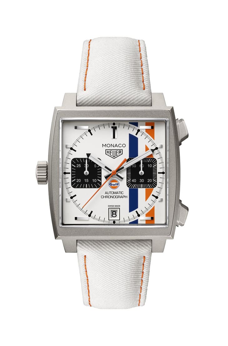 首先看到的是情懷最滿的一款,也就是Monaco x Gulf白面限量版。這次TAG HEUER再度和Gulf攜手合作,這段關係可以追溯到McQueen在1971年電影中開著Gulf配色的保時捷917K,當時他手上就是戴著Monaco,賽車服上還繡著 Gulf和HEUER的標誌,整個人帥到不行。這款白面限量版全球只有971只,就是致敬當年電影上映的年份,手錶在設計上保留了Calibre 11機芯與左側錶冠等經典特徵,銀白面盤上有經典的藍橘Gulf條紋,加上白色Nomex織布錶帶,還原當年電影中的賽車服質地,連細節都很用心。