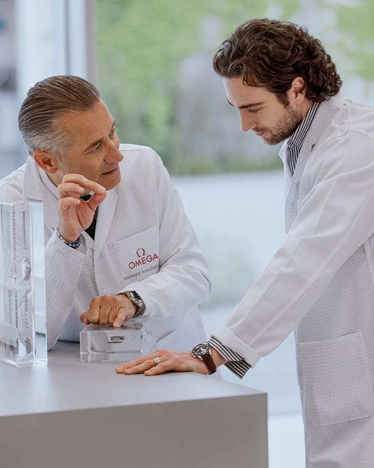 ▲亞倫泰勒強森成為歐米茄品牌大使後造訪位於瑞士比爾(Bienne)的品牌總部,在歐米茄總裁暨執行長Raynald Aeschlimann引介下參觀錶廠。