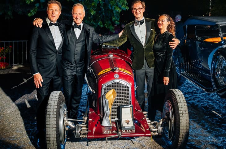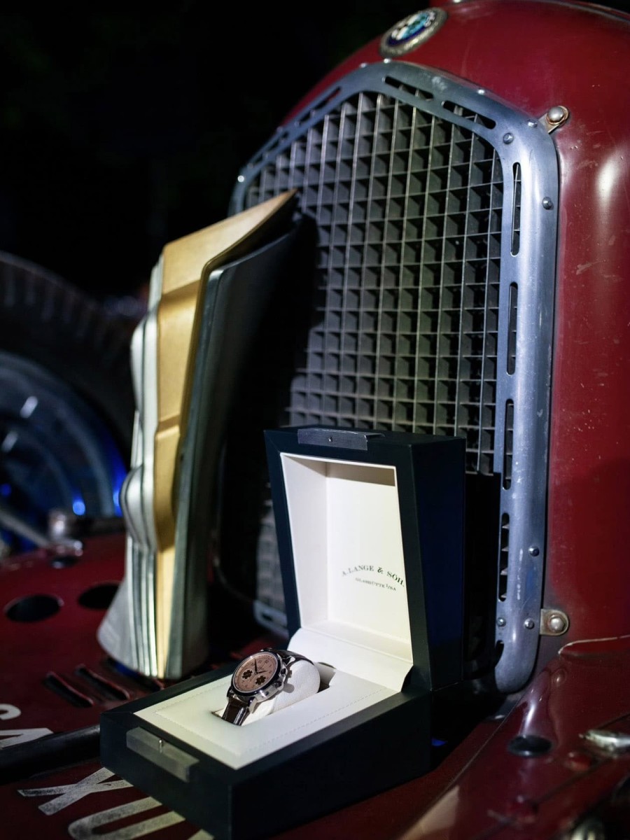 在這場活動中,朗格不只展示手錶,還很夠意思的頒發獎品給獲獎車主,像是給"Best of Show"得獎車主的那只特別版1815白金計時碼錶,手錶面盤用的是實心玫瑰金,也就是大家常說的鮭魚面,錶背還刻有專屬徽章,平常在店上可是買不到,由於這份特殊意義,使得手錶超過一般紀念品定位,尤其對鐘錶迷而言更是那種會眼睛發亮、心臟漏拍的收藏級作品。2025年這份大獎就頒給了德國收藏家所有、1934年出廠的ALFA ROMEO Tipo B(P3),那可是汽車界的神獸等級。