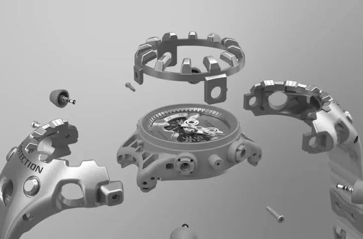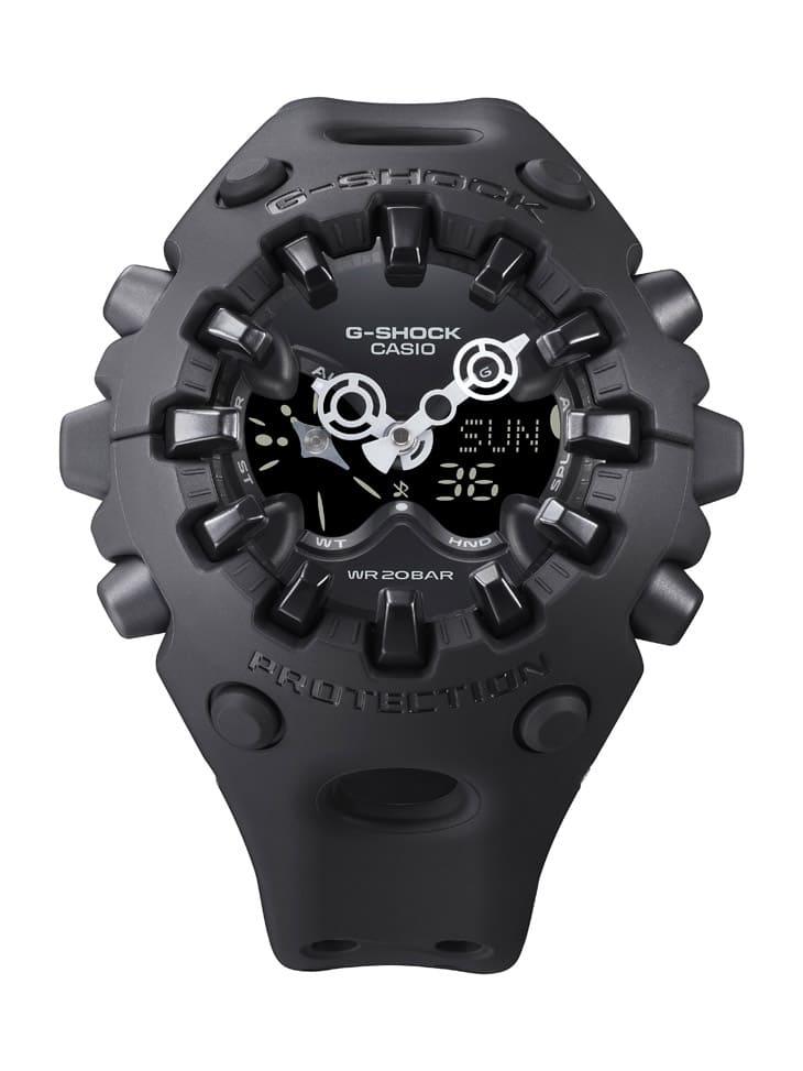 GA-V01最直觀的變革來自於它充滿力量感的外觀,乍看像是某種外星生物般打破傳統手錶設計框架,G-SHOCK這次採用了一體成型的錶圈與錶帶設計,形成猶如裝甲般的外殼,將內部錶殼層層保護起來,配上立體浮突的大型時標,官方稱之為「Bumper Index緩衝器時標」,這些時標直接配置於球形玻璃的上方,從視覺與結構兩方面提供雙重防禦,也讓整體設計充滿未來感與層次。