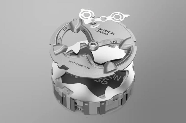 GA-V01系列最令人眼睛一亮的技術突破,是G-SHOCK自主開發的磁力吸附指針模組、又稱「Shock Release Hand 衝擊釋放指針」,在傳統機芯中,分針必須緊密固定在軸心上,但在強烈衝擊下容易損壞或偏移,而這項新技術改用磁力吸附的方式,讓分針在撞擊時能夠稍作晃動吸收衝擊能量,等衝擊過後再自動校正回定位。這不只是一項耐用技術,更解放了設計的自由度,讓G-SHOCK得以使用更大、更有辨識度的指針而無需擔心耐用性問題,對於一個以實用機能為基礎的潮流手錶品牌來說,這無疑是一項質的飛躍。
