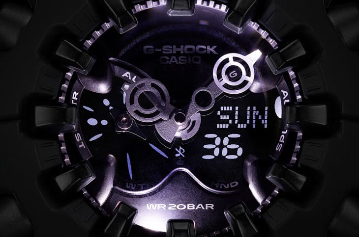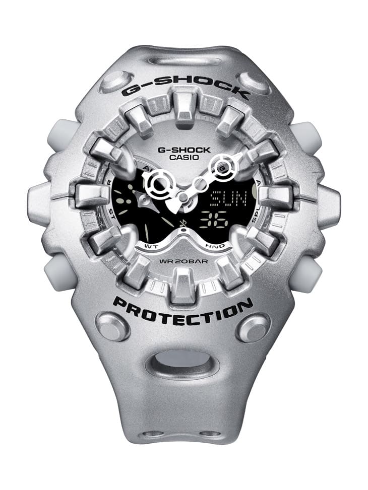 這樣的結構設計不只是好看,更呼應G-SHOCK長年累積的抗衝擊經驗,外觀所有看似裝飾性的元素,其實都帶有保護或功能意圖,整體造型融合剛硬稜角與金屬面盤,並搭載超大指針與大型LCD數位顯示,呈現一種介於機械未來與數位街頭的嶄新語言。