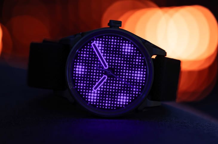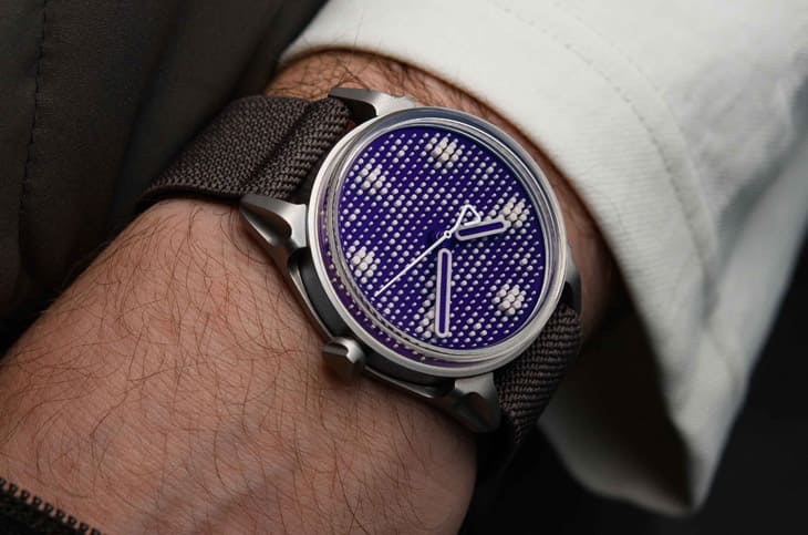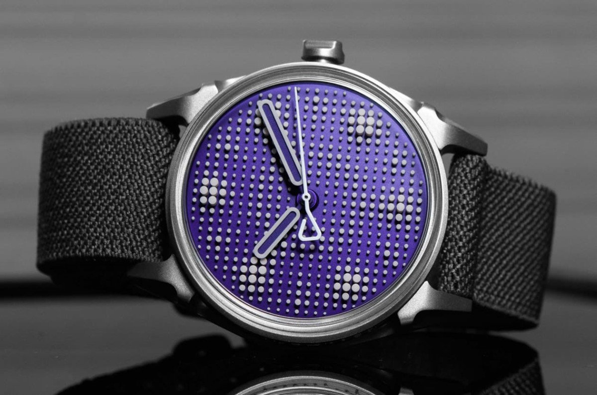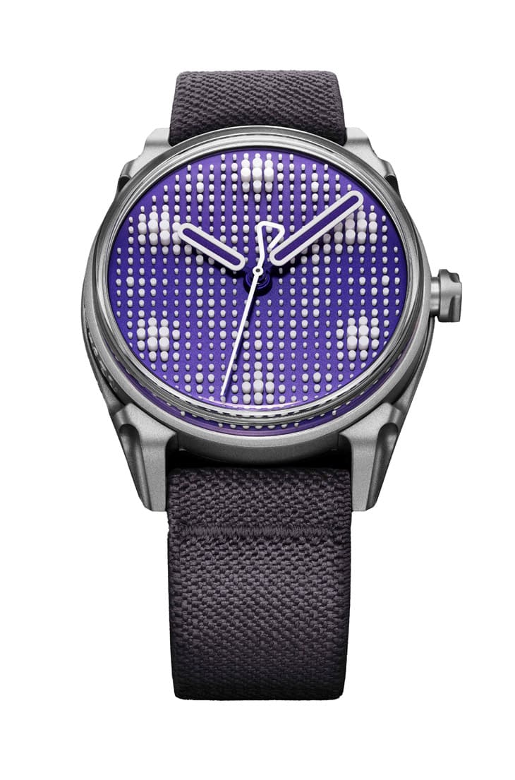 設計上的最大焦點,毫無疑問是全新面盤,這次拋開了先前作品的像素化時標,以三區塊分布打造出更自由奔放的佈局,加上偶數時標位置密集排列的銷釘群組,讓視覺層次更豐富;至於色彩方面,則選用深紫調金屬霧面,會隨光線角度在黑色、靛藍與亮紫羅蘭之間變幻,光影效果極其迷人。
