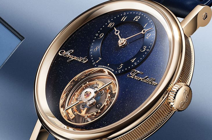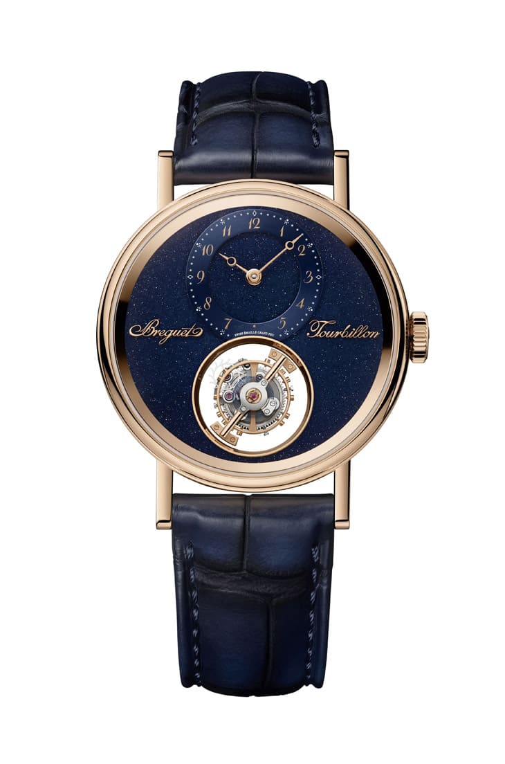 ▲Classique 7255天體陀飛輪以砂金石琺瑯映襯偏心時分盤,飛行陀飛輪位於6點鐘,搭配寶璣經典指針與字樣,整體構圖精緻而充滿宇宙感。