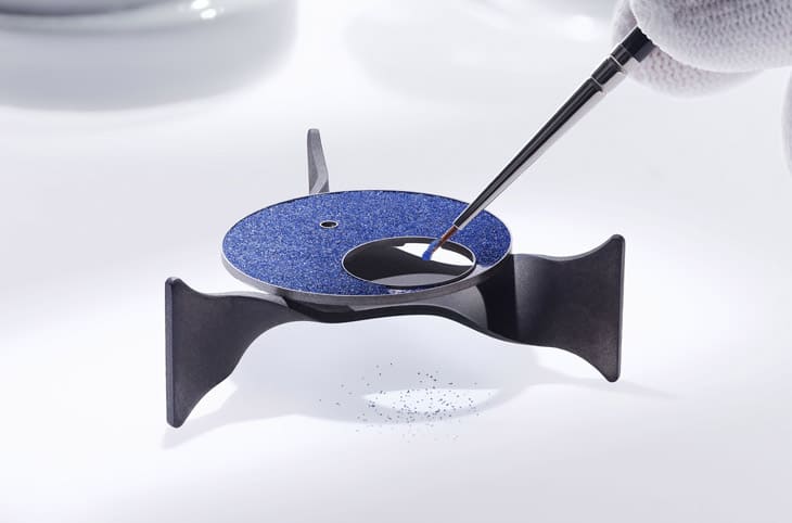 製作過程首先需將砂金石玻璃原料研磨成粉末,為了獲得最佳視覺效果,粉末的配比與顆粒大小均需悉心控制,且需略大於傳統琺瑯粉末,製作這枚面盤至少需要塗覆五層砂金石粉末,每一層都必須在超過800攝氏度的窯爐中燒製,每次煅燒都必須非常小心地精準掌控,一旦時間過長或溫度過高,都會影響最終的成品品質。如此繁複工序造就的手錶的面盤,深邃藍釉上星點密佈、熠熠生輝,宛若點綴蒼穹的繁星,向迷人的天文學致敬,也具體和「Sidéral」(天體)這個命名互相呼應。