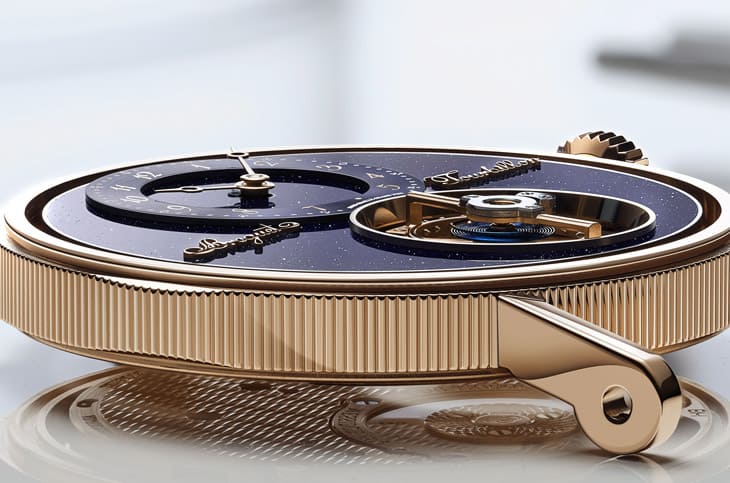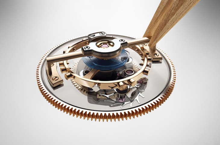 ▲僅由下方支撐的飛行陀飛輪,結合藍寶石橋板與隱藏傳動裝置,造就宛如懸浮般的機械奇觀。
