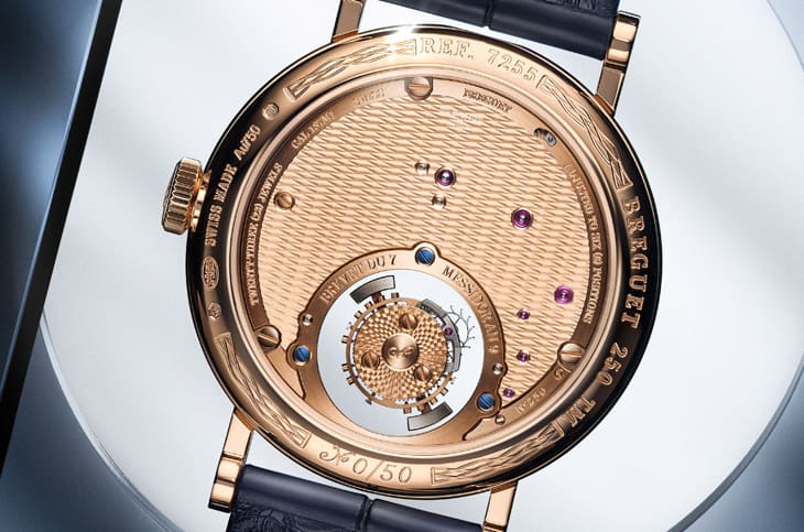 至於手錶最大驚喜莫過於BREGUET首次採用的飛行陀飛輪設計,傳統陀飛輪結構多由上下兩側橋板固定,而Classique 7255的陀飛輪則直接取消上方橋板,讓整個機構像是懸在空中,而為了進一步強化這種「懸浮感」,寶璣又加上了自己多年研發有成的「神祕」結構,簡單來說整個陀飛輪裝置包括中層支撐橋板和底座均採用純淨透明的藍寶石材質製作,並經防眩光塗層處理,經由透明藍寶石橋板進行巧妙的傳動,使能量傳遞過程在視覺上完全隱匿,讓機械運作顯得毫無破綻地「漂浮」。齒輪系和框架之間的接觸點亦採用偏心設計,巧妙避開陀飛輪鏤空處,在面盤上無跡可尋,營造出富有未來感的通透視效。