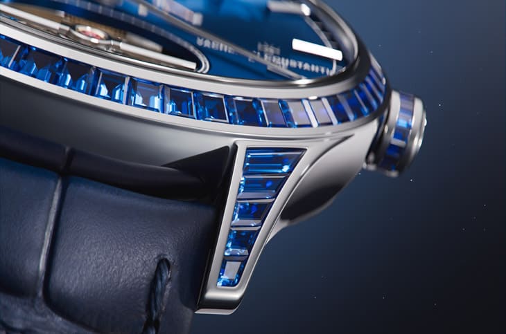 手錶採用39mm的白金錶殼,外觀線條圓潤優雅,而錶圈、錶耳與錶冠則鑲嵌總重逾3.8克拉的長階梯形切割藍寶石,在細節處即顯非凡,值得一提的是,這些寶石透過精準軌道式鑲嵌排列於無金屬隔邊或鑲爪的錶圈上,視覺效果宛如群星懸浮於錶殼邊緣,與星座主題自然呼應。