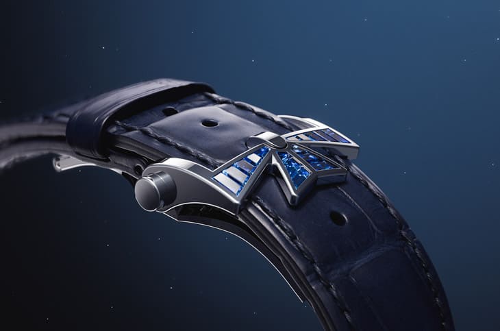▲白金摺疊扣鑲嵌16顆藍寶石,搭配深藍鱷魚皮錶帶,延續錶殼風格,細節中體現對整體設計一致性的堅持。