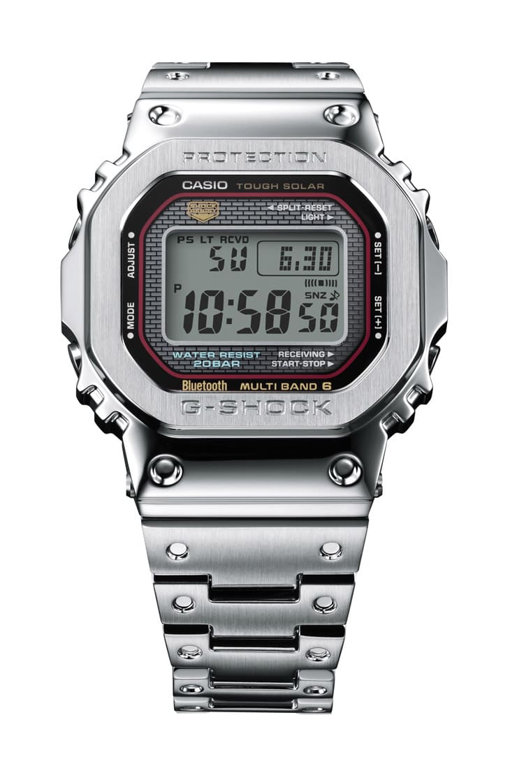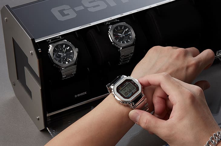GMW-B5000D延續了初代方形錶殼的設計特徵,另外像是磚紋面盤與"SHOCK RESIST"字樣都一一還原,其全不鏽鋼錶殼經過鍛造、切割與拋光等多重工藝處理,錶圈表面施以髮絲紋,側面則是鏡面拋光,金屬質感層次分明。