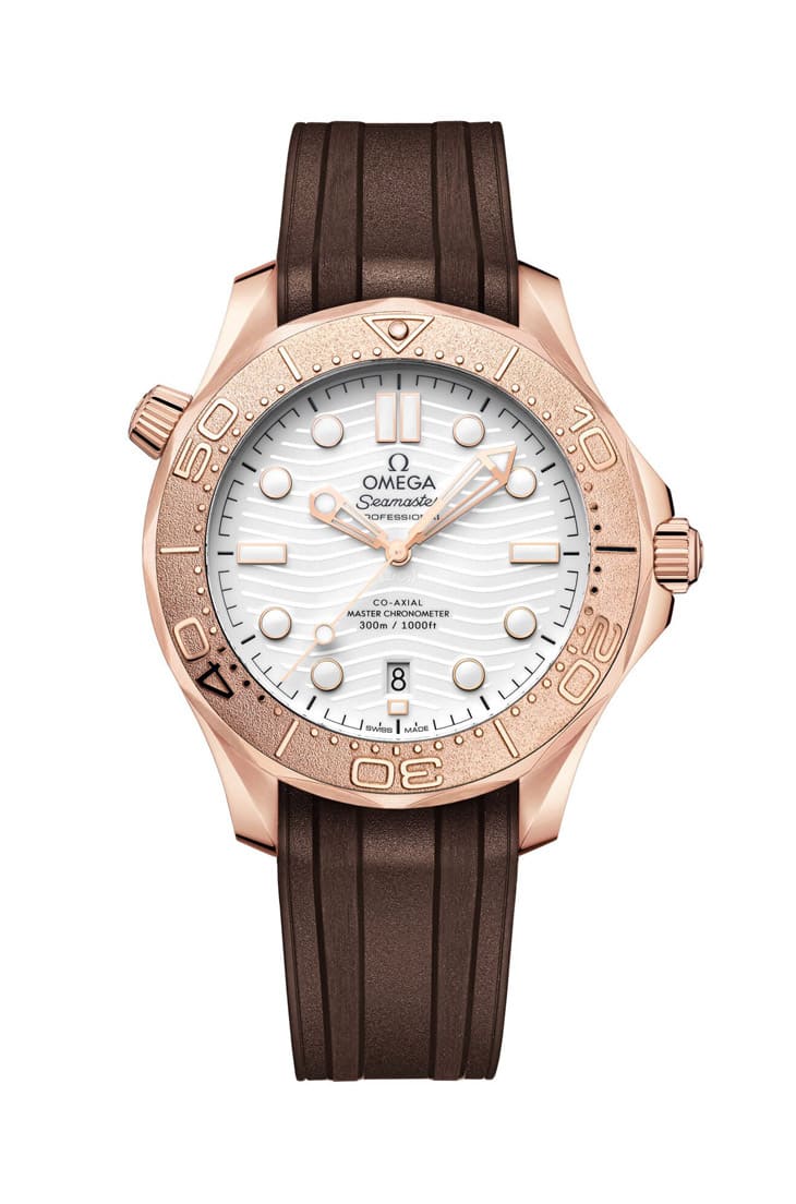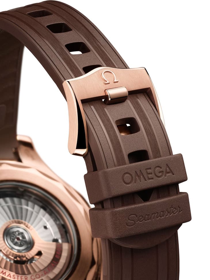 首先看到Sedna™金版本(型號210.52.42.20.04.001),這種帶有溫潤玫瑰金色調的合金,是OMEGA在2012年自家研發而成,具備更穩定的色澤表現,不易隨時間氧化變色,錶殼與錶圈皆採用同材質製成,整體視覺協調性極高,搭配白色陶瓷面盤與經典波浪紋路,營造出陽光下特別耀眼的視覺張力,時標與指針皆經過Sedna™金PVD處理,而棕色橡膠錶帶則為整體風格添上柔和大地色調,氣質既奢華又親切。