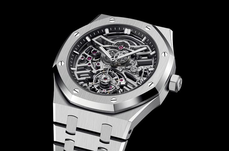 AP這只錶的來歷不簡單,它是皇家橡樹系列50週年出道的紀念之作,因此目前已經停產,它是該系列首度搭載「自動鏤空飛行陀飛輪」的作品,不鏽鋼錶殼與全鏤空面盤讓2972機芯的精密結構一覽無遺,飛行陀飛輪在其中運轉,宛如微縮的動態雕塑,這枚機芯由271枚零件組成,動力儲存65小時,底蓋上"50 YEARS"的特製自動盤更是致敬經典的細節之一。