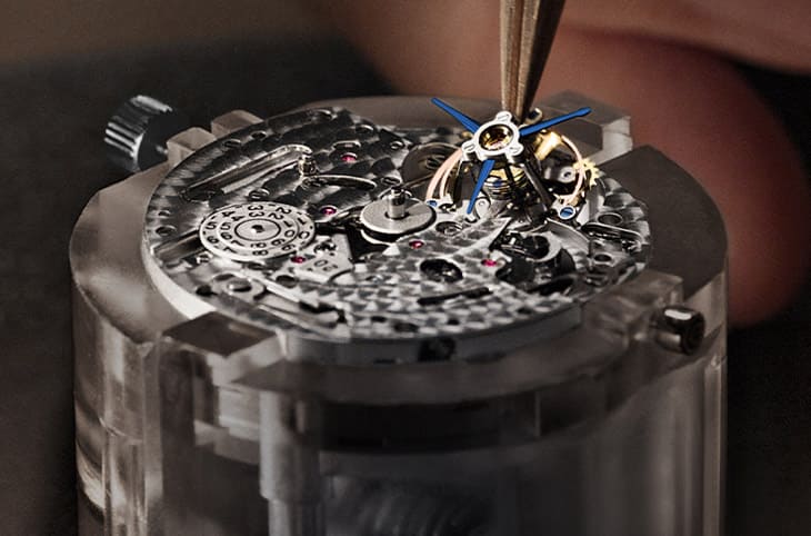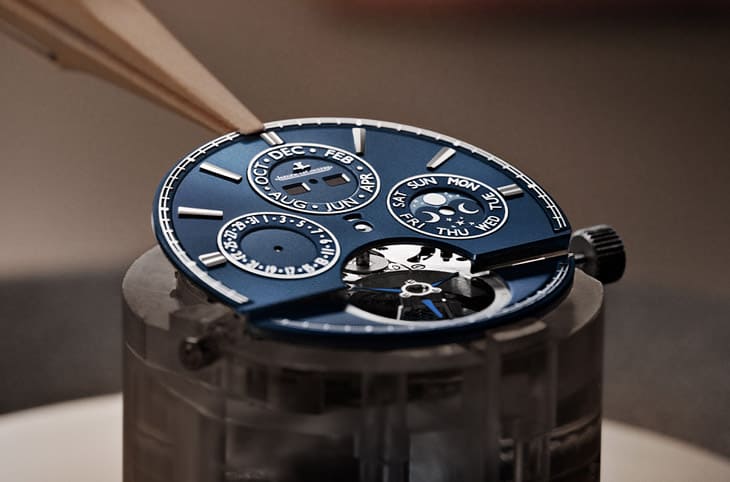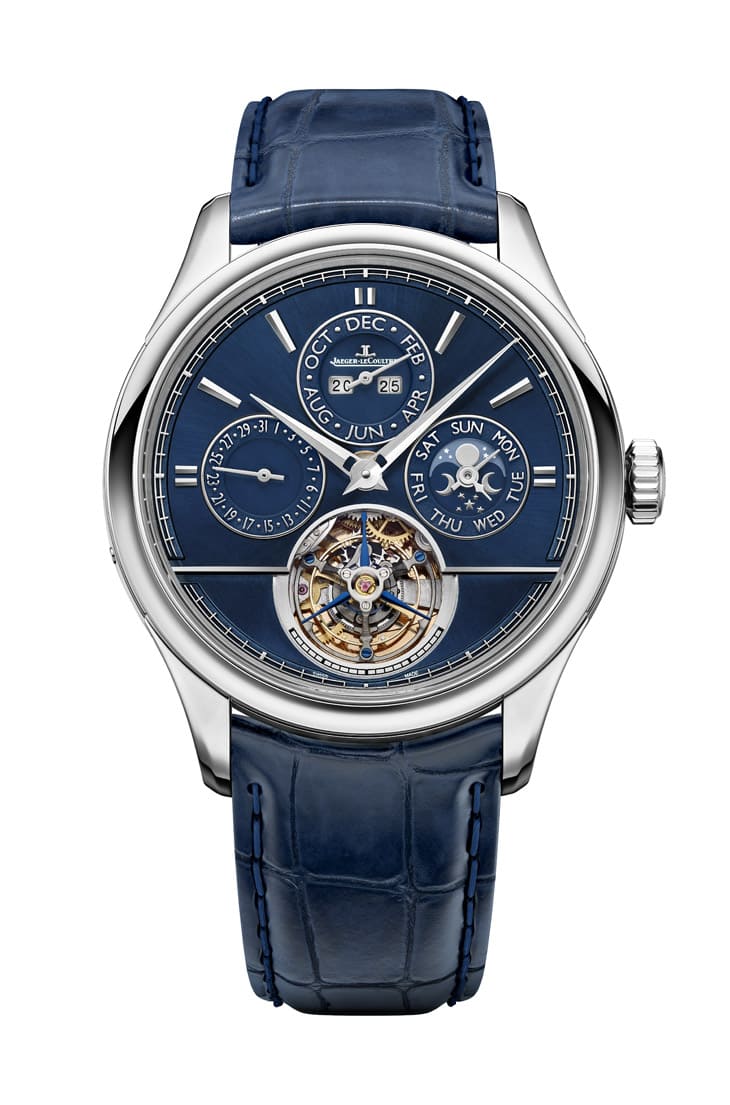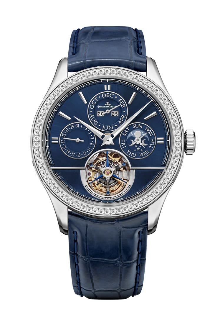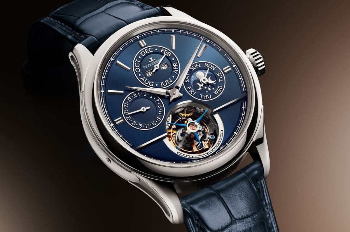 積家以超過80枚獨立零件組合而成,並透過拋光、磨砂、微噴砂等多層次修飾,讓鉑金展現冷峻質感,玫瑰金散發溫潤光澤,螺旋式錶耳與鱷魚皮錶帶相得益彰,藍色或棕色皮革與錶殼材質相互呼應,細膩而不張揚。面盤設計則將技術與美學融合得恰到好處,橫跨其上的手工倒角錶橋是系列的招牌元素,為整體佈局增添建築感,陀飛輪被置於凹陷空間中,強化立體深度;放射紋與乳白色中心的對比,加上隨光變化的藍或棕色面盤,形成豐富的視覺層次。特別值得一提的是陀飛輪下方的20秒弧形刻度,三枚藍色指針直接安裝於陀飛輪框架上,隨著每分鐘旋轉而移動,彷彿在舞台上演繹動態詩篇,至於鑲鑽鉑金款,72顆長方形切割鑽石點亮錶圈,與藍色面盤交織出耀眼光芒,背後更是積家Métiers Rares工坊15小時的手工結晶。