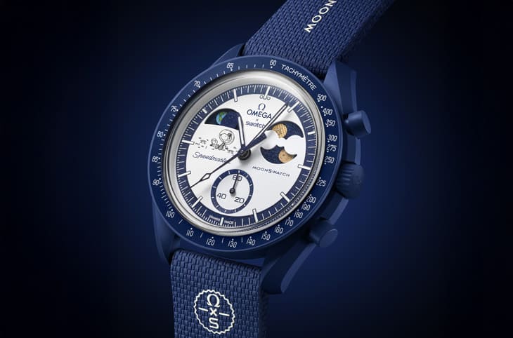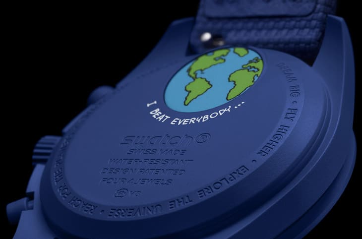 錶殼、錶冠與按把均採用深邃海軍藍色Bioceramic生物陶瓷材質,搭配同色系VELCRO®橡膠錶帶,設計忠實延續 OMEGA超霸登月錶的經典元素,例如不對稱錶殼與內凹式小錶盤,並在錶冠與面盤上印有OMEGA x SWATCH聯名標誌,翻至背面,任務宣言與地球圖案點綴在電池蓋上,呼應整體的宇宙主題。