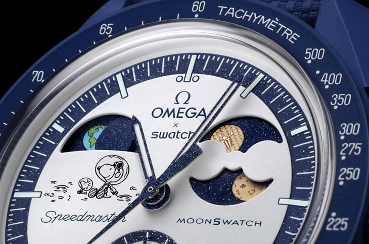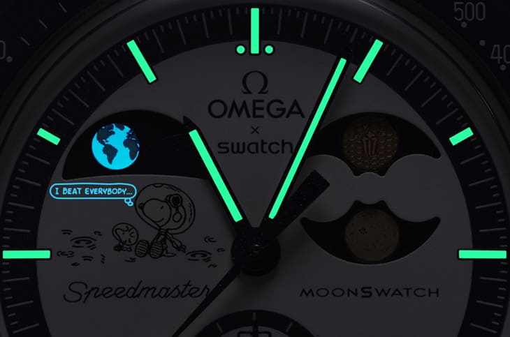 說到MoonSwatch,近兩年史努比的登場幾乎是必備元素,這次依然能在再盤上看到牠與糊塗塔克一同坐在月球上,凝望著遠方的地球,仔細觀察,還能在Moonshine Gold塗層的月亮盤上發現一枚史努比爪印,將童趣與製錶細節自然結合,另一個趣味設計則是隱藏在紫外光下的暗語:"I beat everybody…",這句話不僅是一種致敬,更像是一種挑戰,鼓勵佩戴者勇於超越框架。