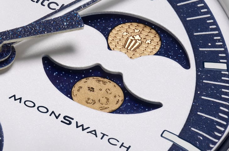 這款手錶的靈感來自每年9月的滿月,也被稱為Harvest Moon或「玉米月」,然而與上個月的鱘魚月版相比,兩者整體造型幾乎一致,主要差異在於月相盤上換上了全新的爆米花圖案:其中一輪金色月亮被設計成玉米粒般的排列,中央點綴著紅白條紋的爆米花盒。這個細節乍看幽默,卻暗藏寓意,就像爆米花在適當條件下瞬間膨脹迸發,象徵創意與想像力在時機成熟時會展現驚人能量,對於MoonSwatch系列來說,這樣的巧思正好呼應它跨界合作與突破常規的精神。