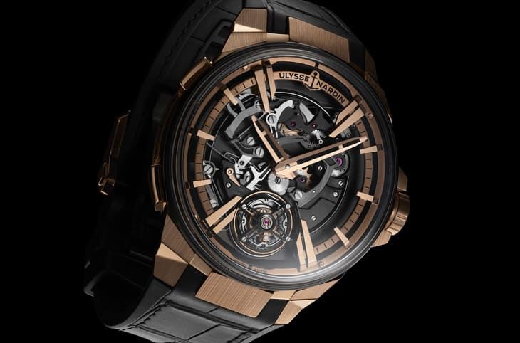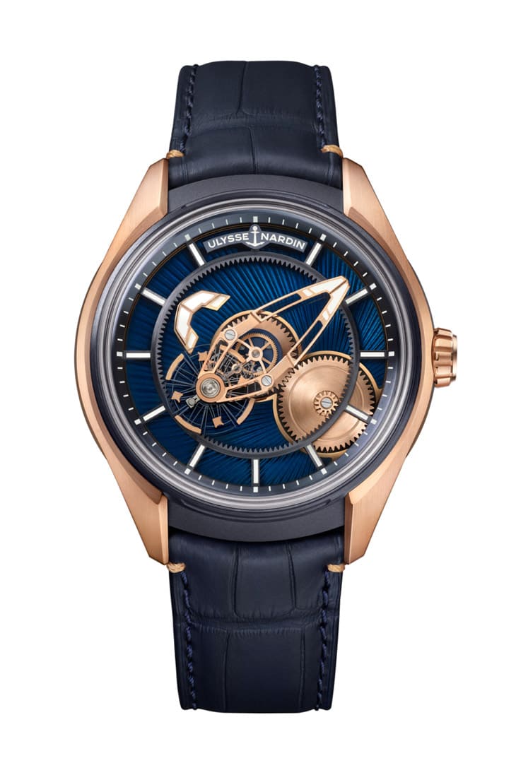 玫瑰金、藍色PVD鈦金屬材質/UN-230自動上鍊機芯/時、分顯示/卡羅素裝置/藍寶石水晶鏡面、透明底蓋/防水50米/錶徑43mm/限量120只/參考價:NT$ 1,477,000
