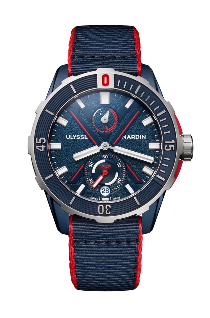▲Diver錘頭鯊特別版採用深海藍PVD鈦殼與藍色橡膠單向旋轉錶圈,面盤紅藍X標誌醒目,夜光小秒針與紅色護肩設計兼顧潛水安全與實用性。