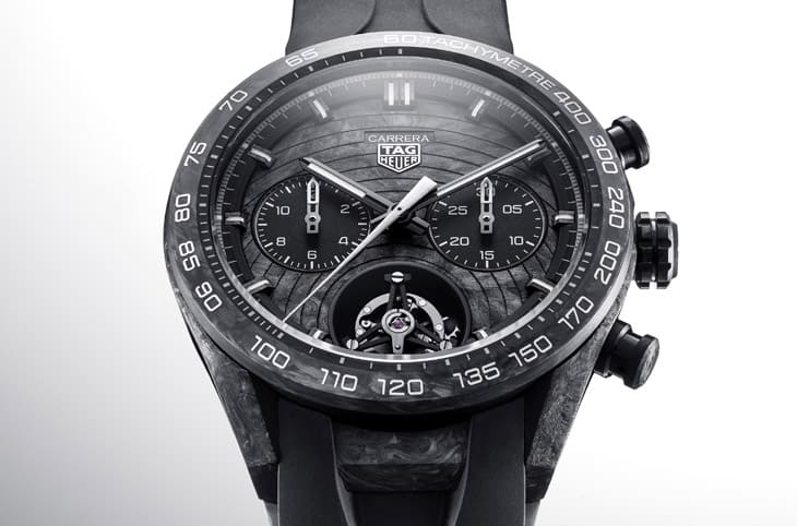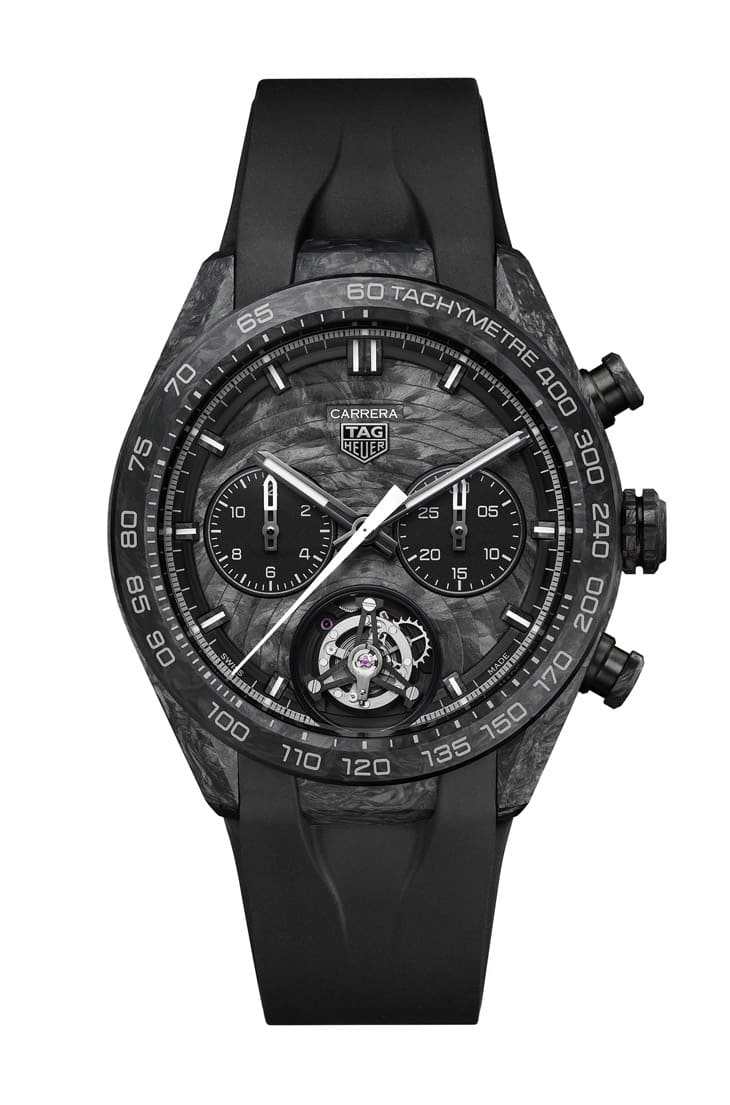 ▲Carrera系列TH-Carbonspring前衛碳游絲陀飛輪計時碼錶配備碳纖維細節與螺旋紋面盤,搭載TH20-61陀飛輪計時機芯,僅限量50只。