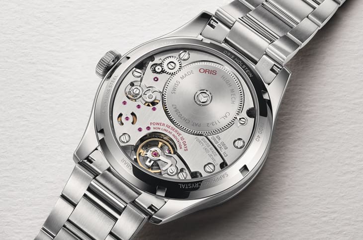 Big Crown Calibre 113搭載ORIS 100系列的Calibre 113手動上鍊機芯,擁有令人印象深刻的10日動力儲存,其靠著單一大發條盒設計在維持動力穩定的同時,避免了不必要的複雜化。機芯上還搭載專利非線性動力儲存指示,意指指針在動力耗盡時移動速度會放緩,刻度間距逐漸拉大,使使用者能清楚掌握上鍊時機,直覺且實用。